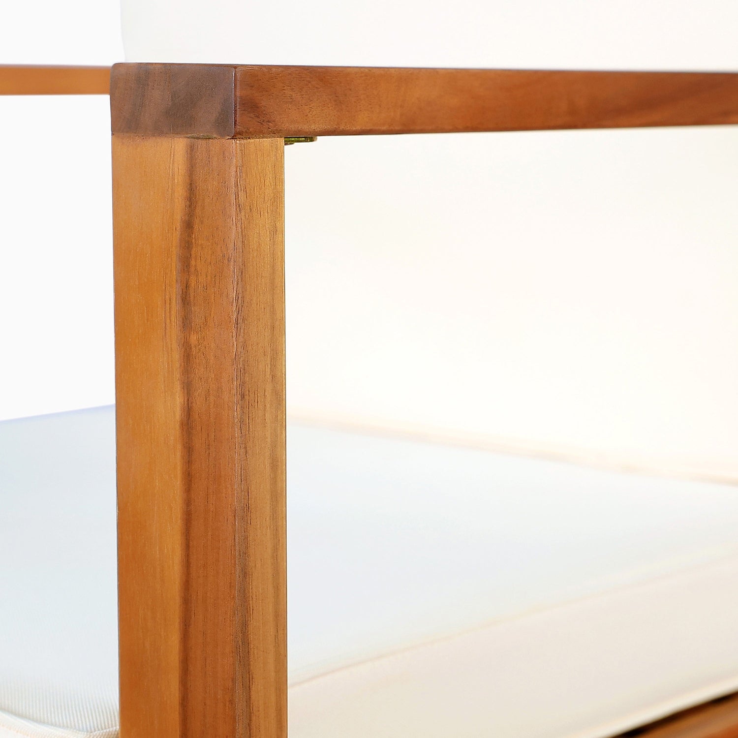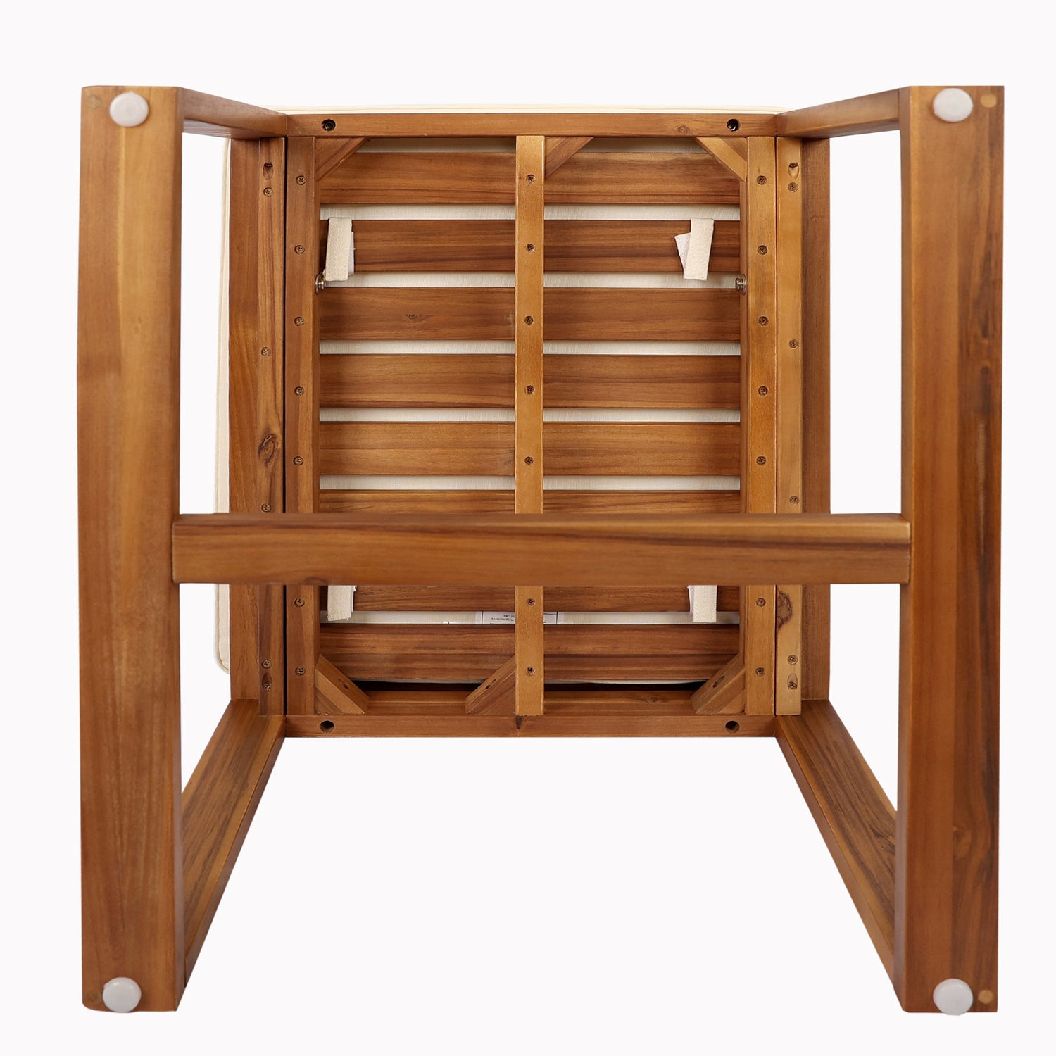 These patio dining chairs are designed for outdoor use, combining comfort and style with their teak-toned acacia wood frames and beige cushions. Ideal for enhancing your patio dining area with functional seating.