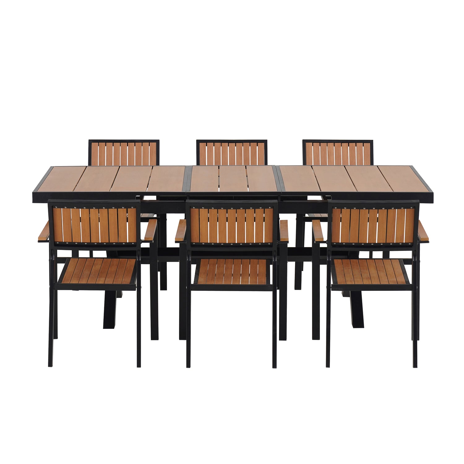 - [Flexible Seating Arrangement]:Featuring a set of six chairs, each crafted with plastic wood panels and reinforced by durable iron frames, this outdoor dining set allows complete flexibility in positioning chairs to suit personal preferences. Perfect for lively gatherings, it encourages creative layouts that enhance social interaction and ensure every seating arrangement feels uniquely tailored.