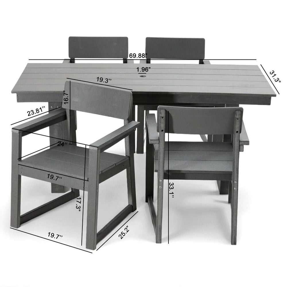 - Complete Set: Includes 1 patio dining table with umbrella hole and armrest chairs, offering stylish and comfortable seating for family meals or gatherings.