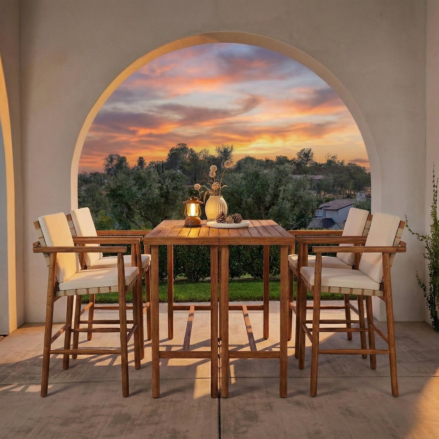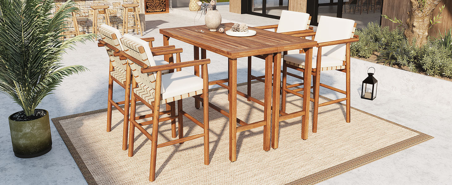 This 6 piece outdoor bar set features a bar-height acacia wood table paired with four cushioned stools, designed to enhance your patio, balcony, or poolside area with both function and style.