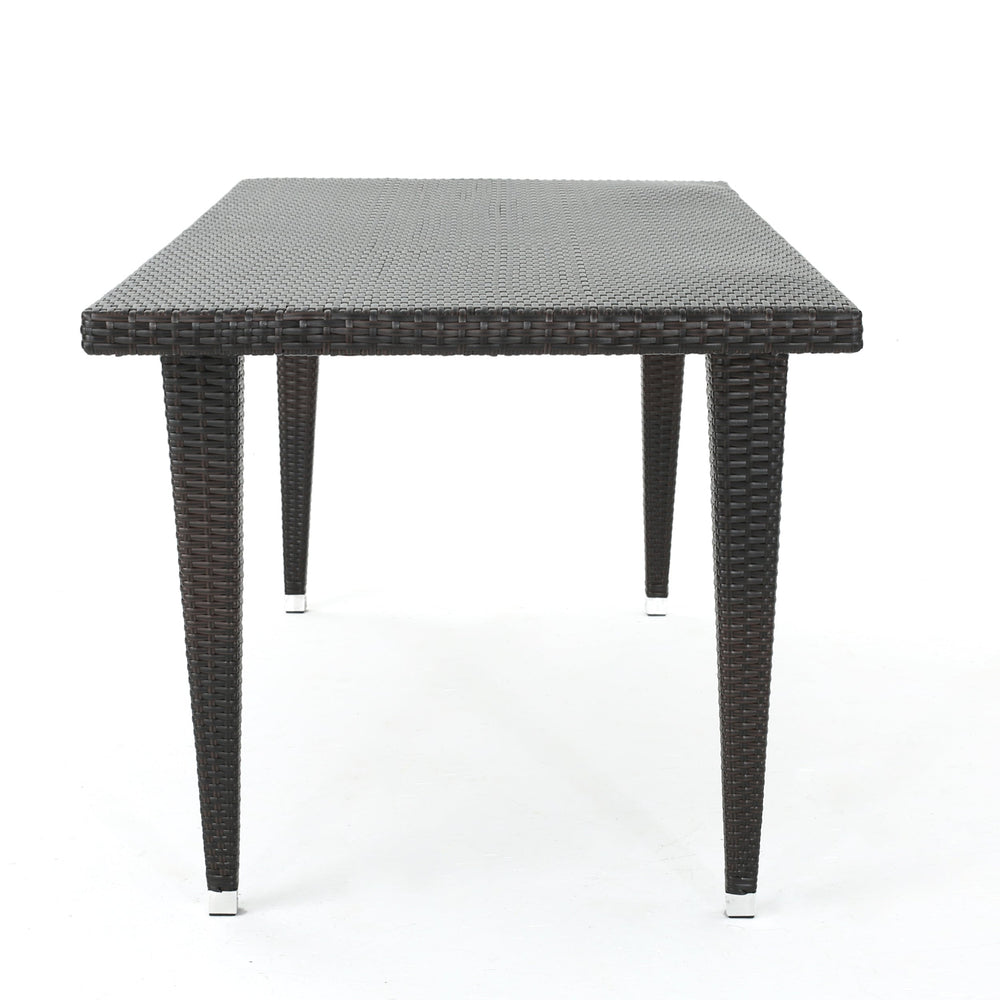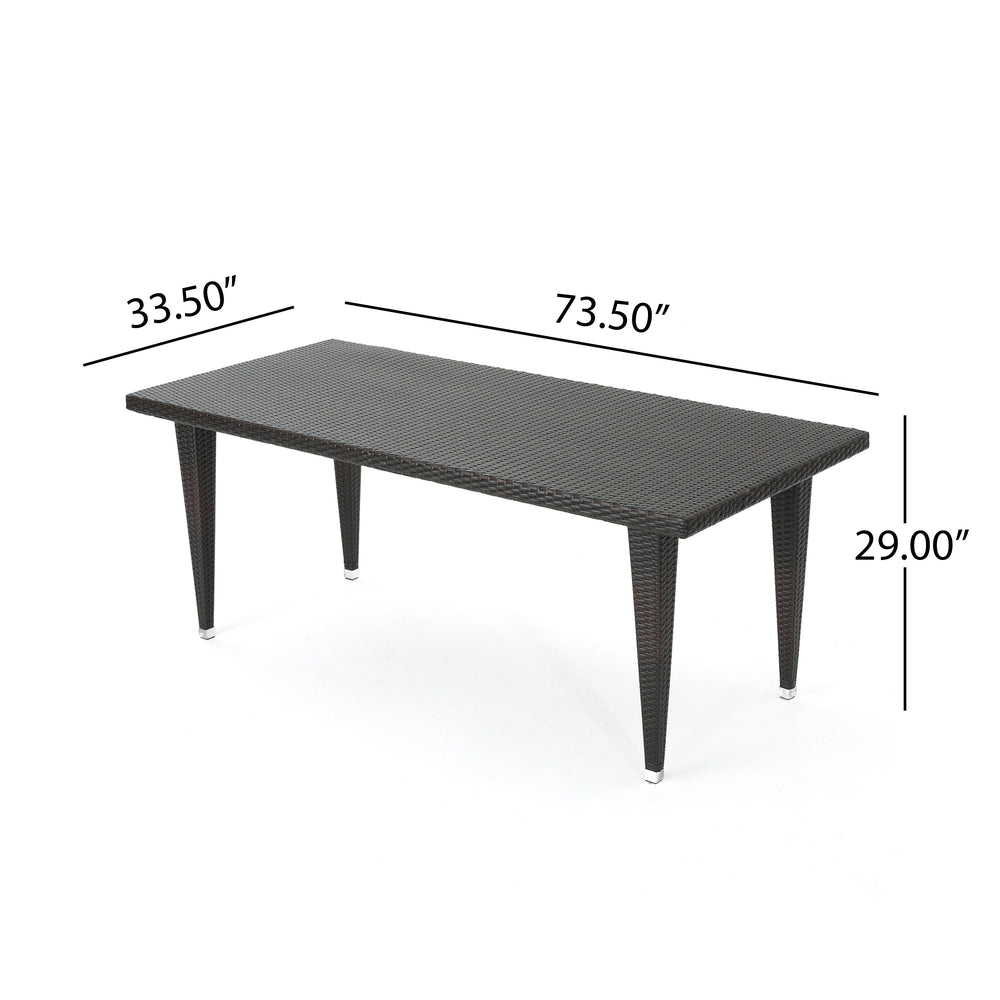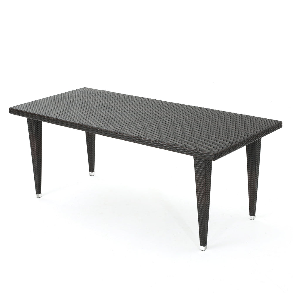 This 9-piece outdoor wicker dining set includes a large modern rattan table and eight chairs, designed to enhance any patio, deck, backyard, or porch with inviting style and function.