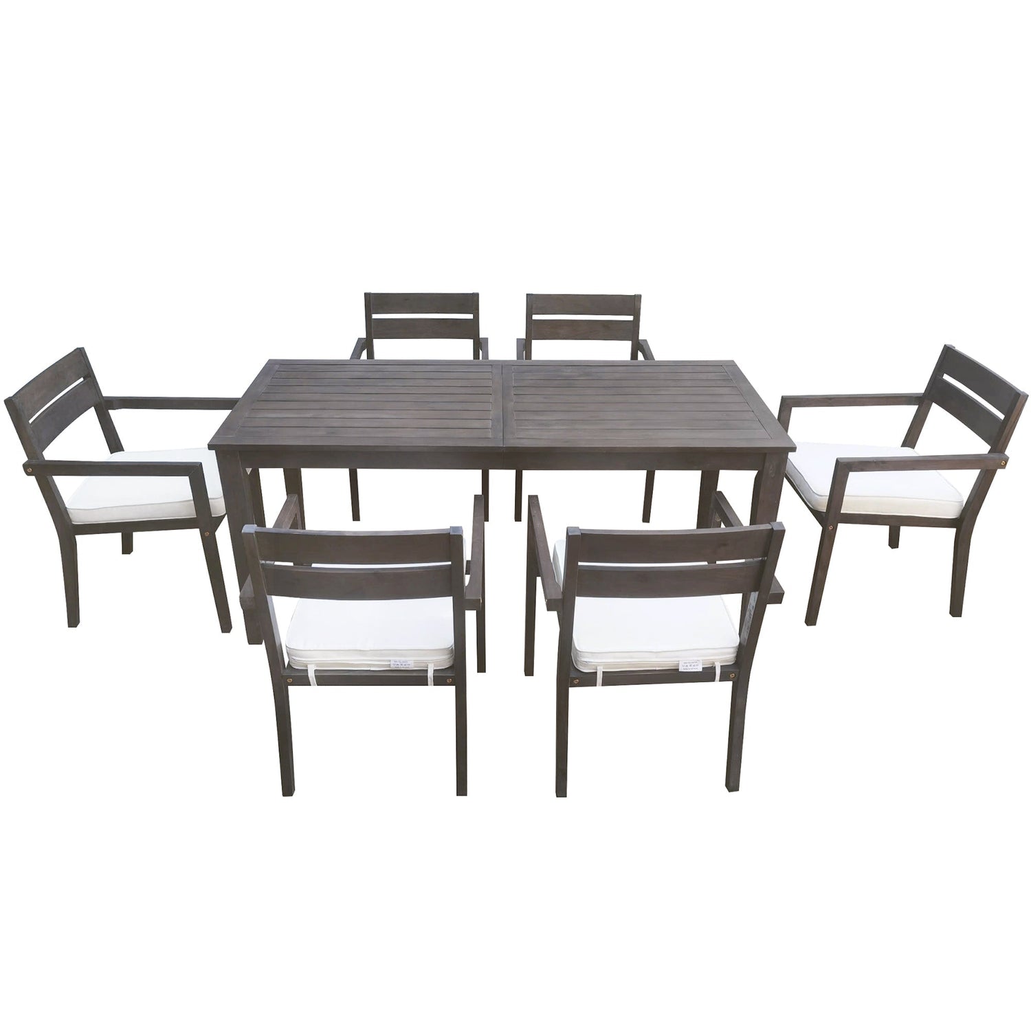 This 7-piece outdoor dining set includes a large acacia wood table and six cushioned chairs, perfect for enhancing your lawn, backyard, garden deck, or poolside dining area with a modern and functional style.