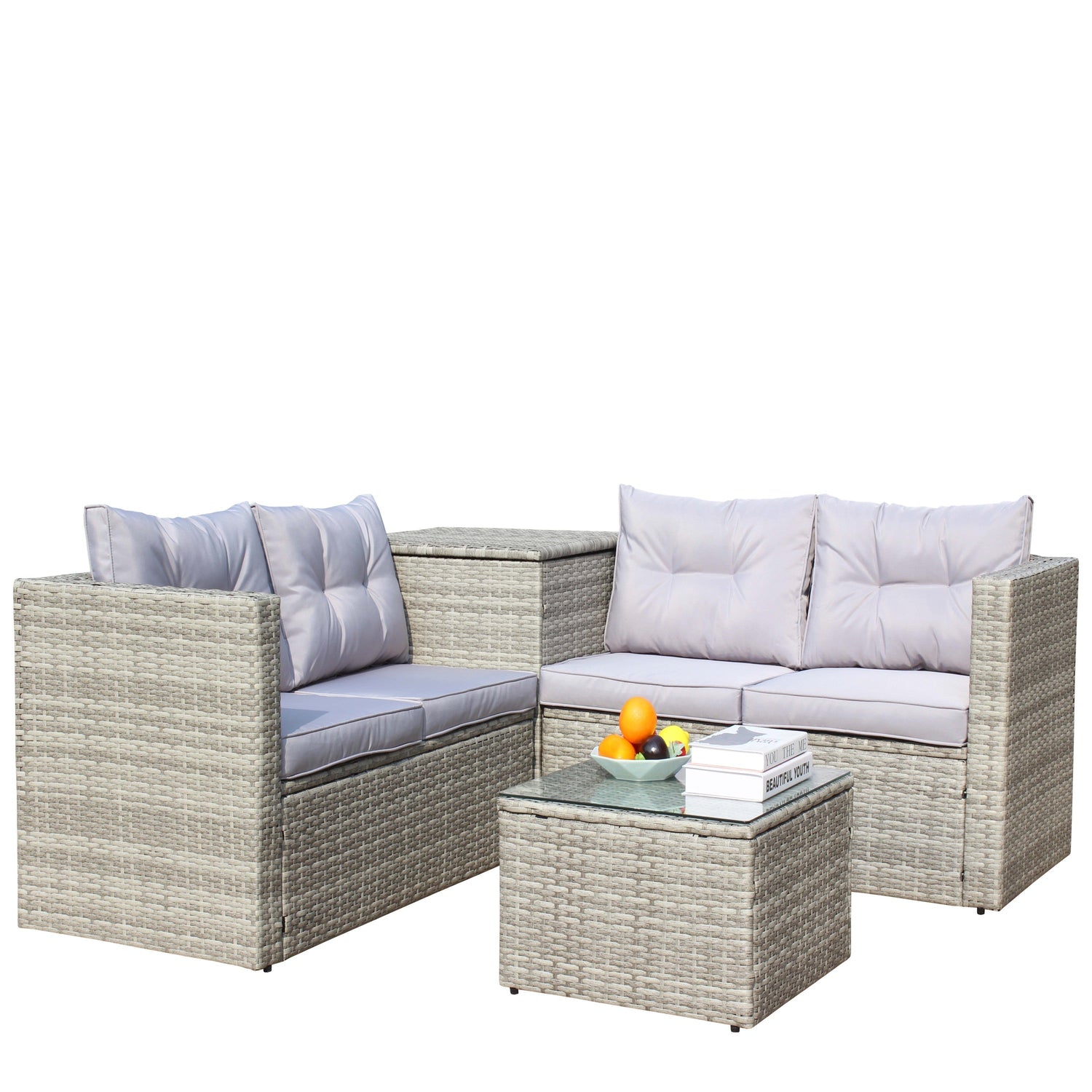- Includes two single armrest loveseats, a side storage table, and a coffee table with clear tempered glass top