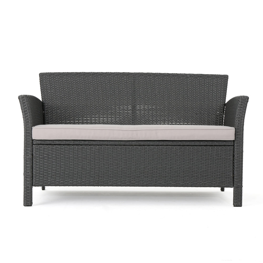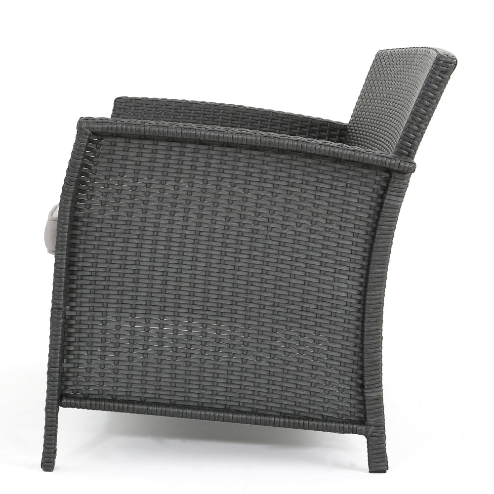 - Crafted from grey PE rattan, iron frame, and waterproof fabric