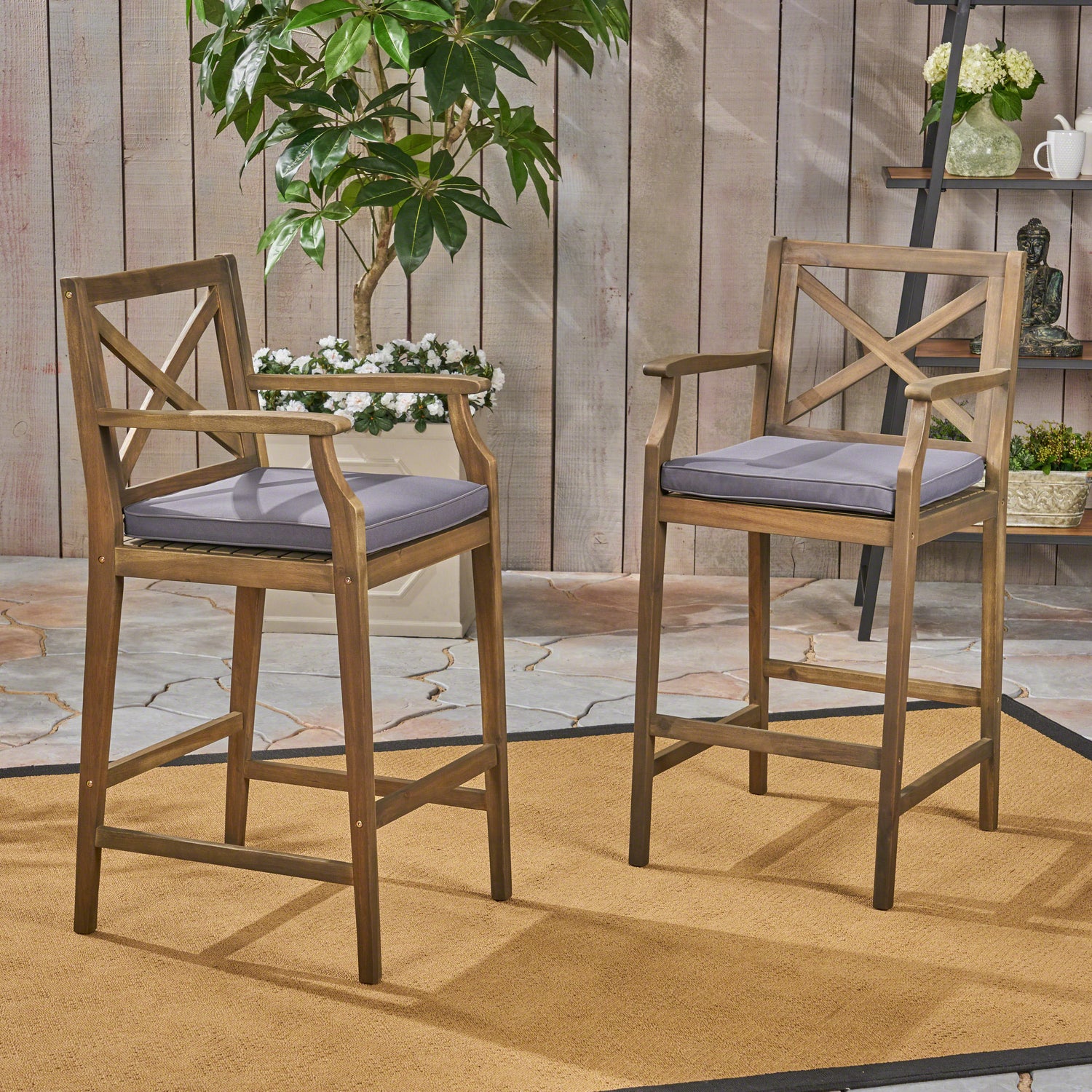 Elevate your outdoor dining or bar experience with the Logan Outdoor Acacia Wood Barstools. Made from durable acacia wood, these barstools bring a touch of sophistication and exotic flair to your space while effortlessly withstanding outdoor elements. The cross-back design adds a touch of rustic charm, perfectly complementing the slat-panel seating and sturdy box frame. With water-resistant cushions, cleaning up spills is a breeze, making these barstools perfect for any outdoor space. Measuring 22.50" W x 24.00" D x 45.75" H with a seat height of 31.00 inches (with cushion), these barstools are the perfect size for any outdoor area. Assembly is a breeze with all instructions and tools included. Transform your outdoor space into a stylish and inviting oasis with the simple addition of this charming set of two barstools. Upgrade your outdoor experience today with the Logan Outdoor Acacia Wood Barstools.