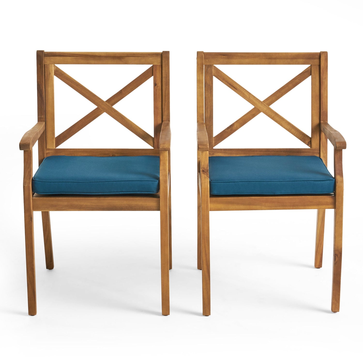 Enhance your outdoor dining space with the Perla Dining Chair set. Featuring two acacia wood chairs with blue cushions, this set offers comfortable and stylish seating ideal for garden, backyard, or poolside areas.