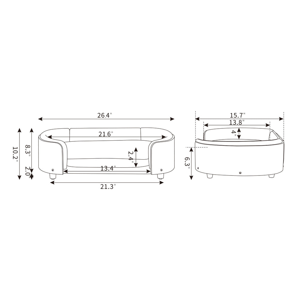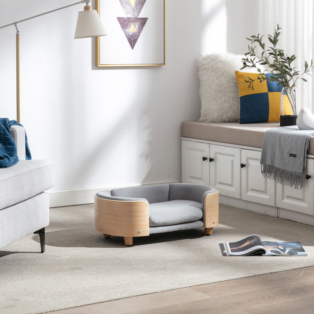 This elevated dog bed features a Scandinavian modern design with clean lines and solid wood legs. It provides a comfortable and stylish resting place for small to medium pets, ideal for any room in the home.