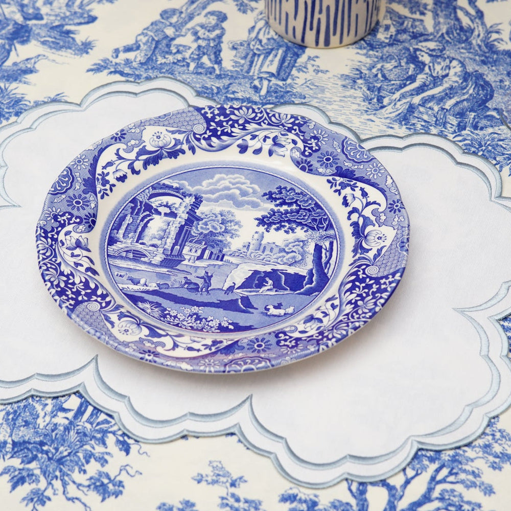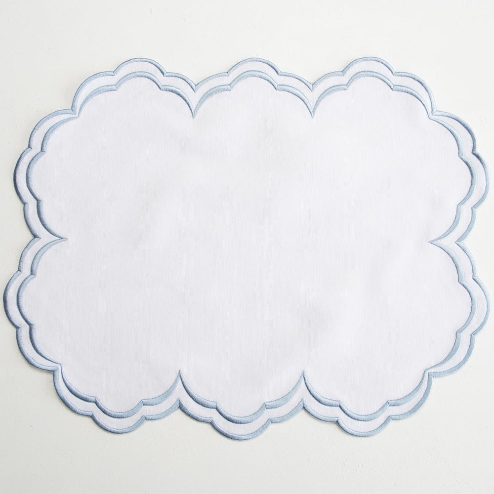 Brighten your table with the delightful Aquelle Placemat. Crafted from a premium cotton blend and delicately finished with blue wavy scalloped embroidery, this design adds a touch of classic elegance to any gathering. Perfect for everyday meals or special occasions.