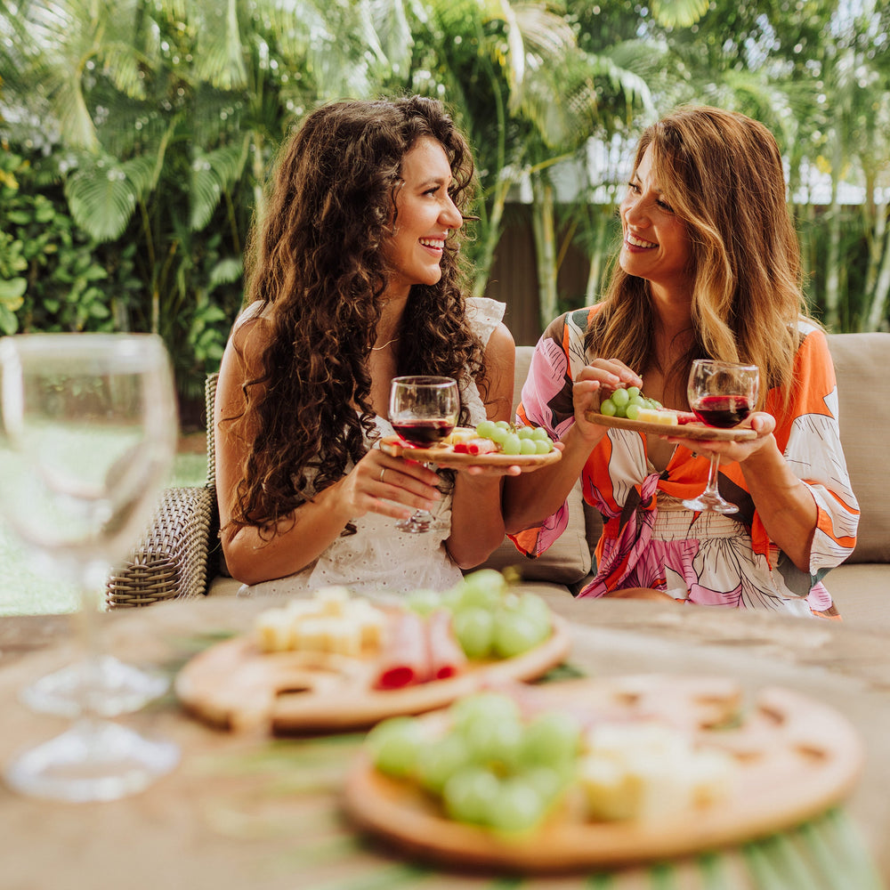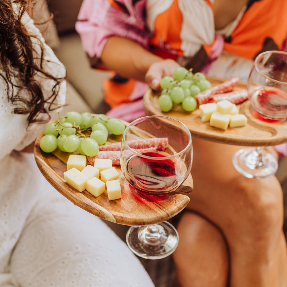 Yes, we understand you only have 2 hands. This is a set of 4 to share with friends. Don't be greedy! The Wine Appetizer Plate Set of 4 are handheld cheese board with wine holder trays that let you enjoy a snack, a drink, and a free hand, all at once! These small wood cocktail plates may not be the main topic of conversation at your next party, but they'll do their best to keep the conversation going all night long, no matter what the topic! Just add a few appetizers, some cheese and charcuterie, a glass of wine, and you're good to go. Why hold a glass in one hand and your apps in the other when you can use a wine glass holder tray for your apps and continue to gesticulate wildly with that free arm.