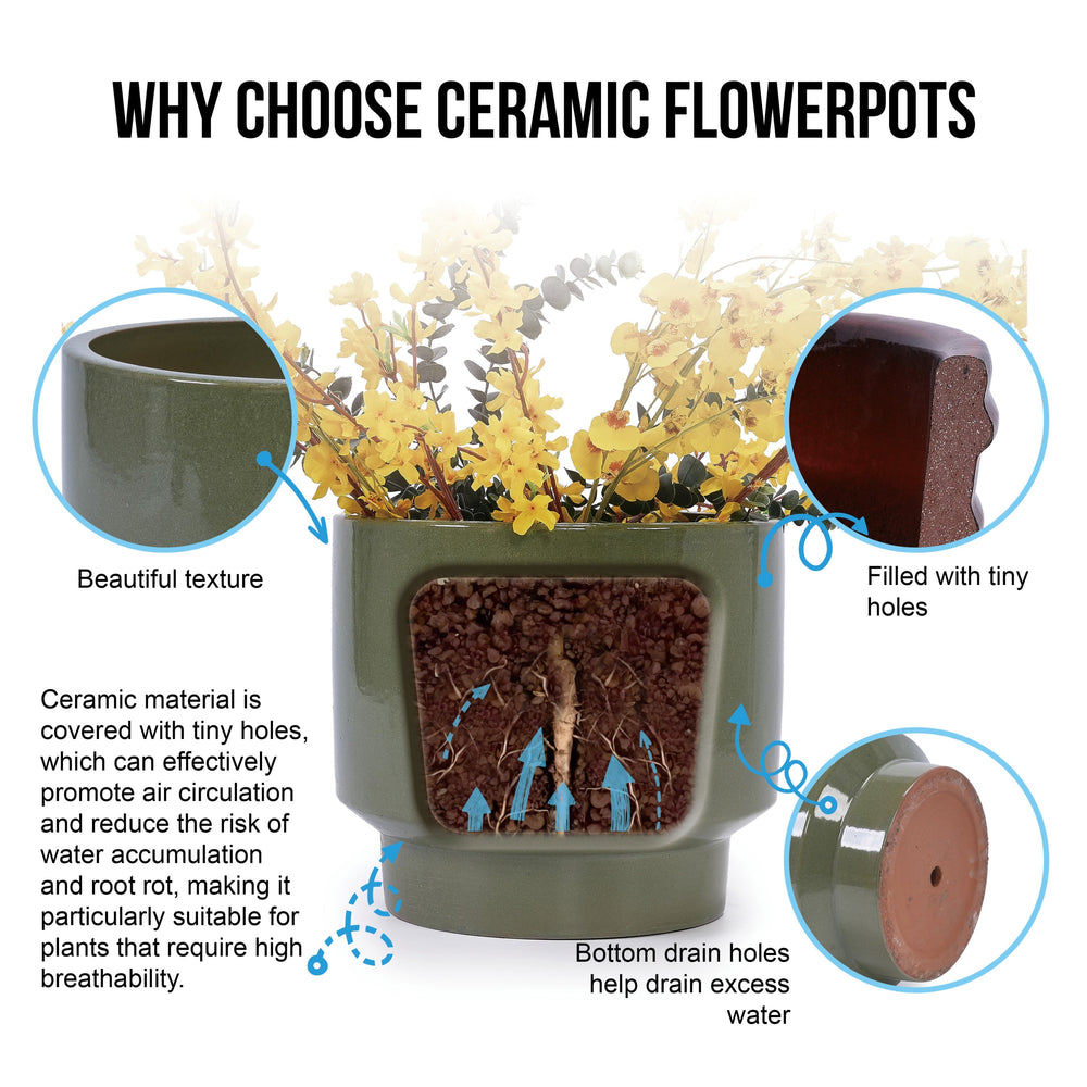This set of three ceramic flowerpots provides a stylish and functional solution for displaying plants in patios, gardens, or windowsills. Finished in antique light green, they blend natural tones with modern design.
