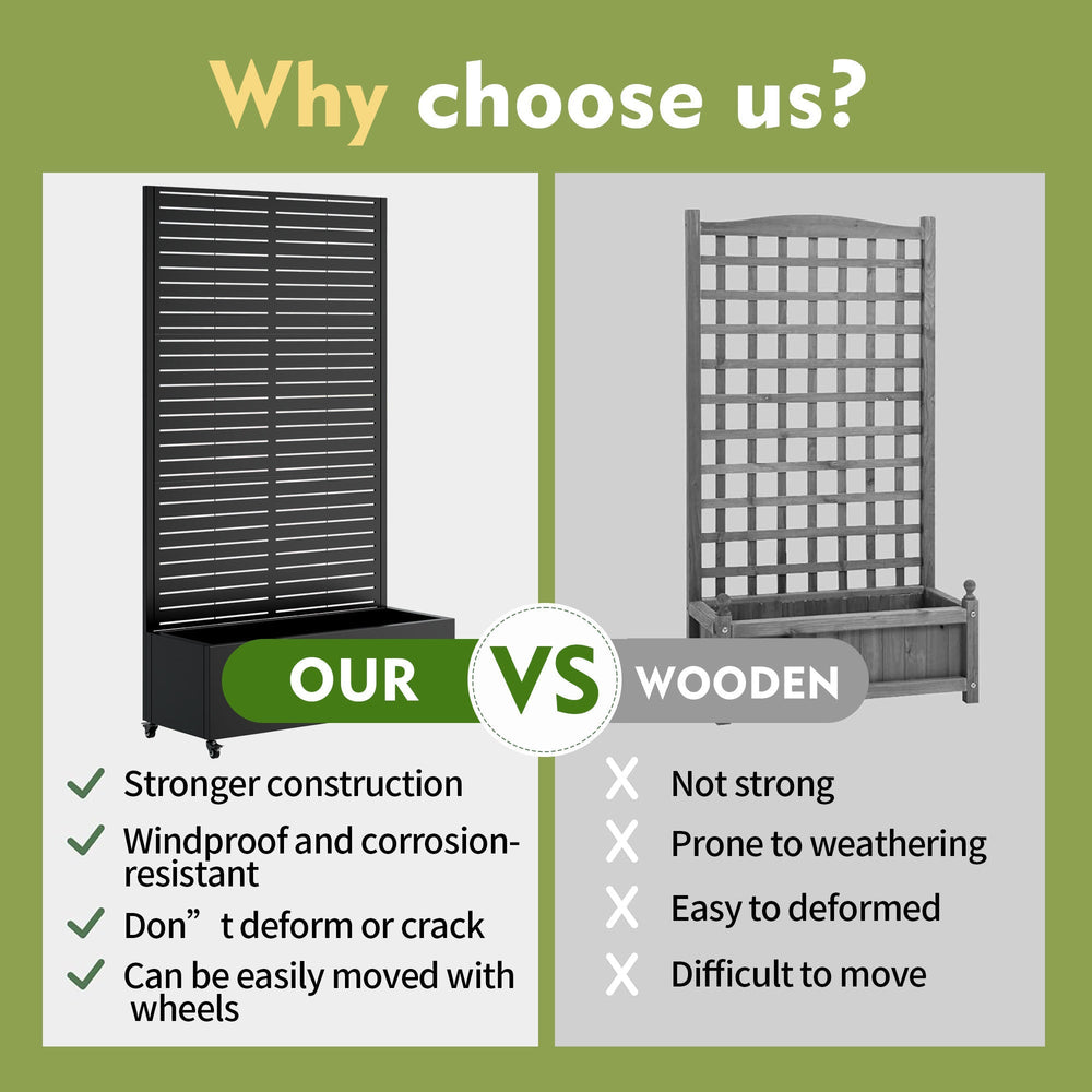 This metal planter box with trellis is a versatile addition to any patio or garden, serving as a raised garden bed, climbing plant trellis, and privacy screen to enhance outdoor living spaces.