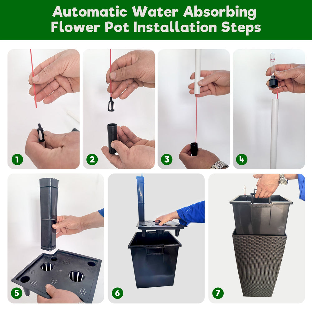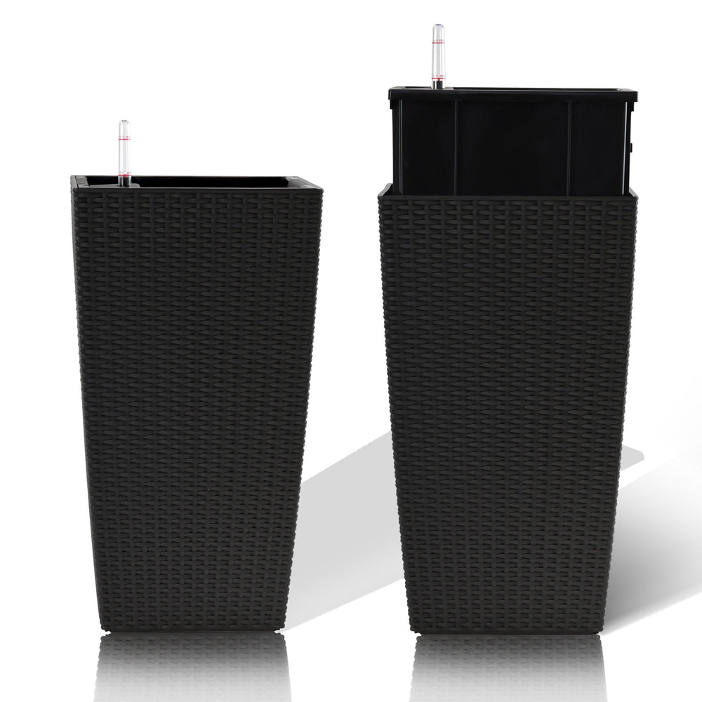This set of two square planters is designed to enhance outdoor spaces such as gardens, porches, patios, or backyards. They combine a rustic faux rattan appearance with a practical automatic watering system for stylish and convenient plant care.