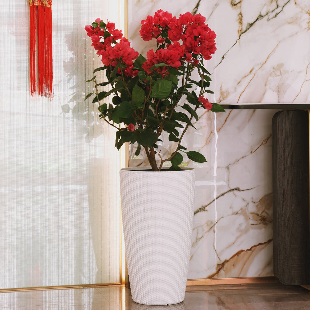 These tall faux rattan planters offer a stylish and functional solution for displaying plants indoors and outdoors, including patios, porches, living rooms, and gardens. They combine elegant design with convenient plant care features.