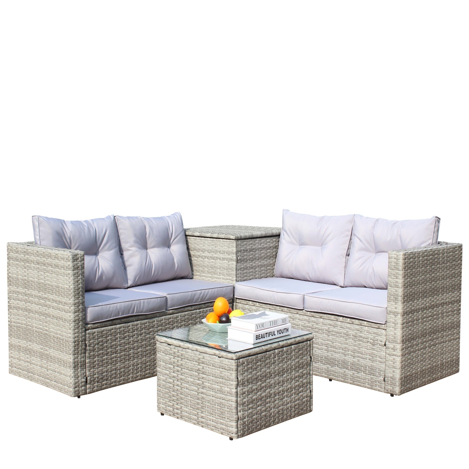 - Includes two single armrest loveseats, a side storage table, and a coffee table with clear tempered glass top