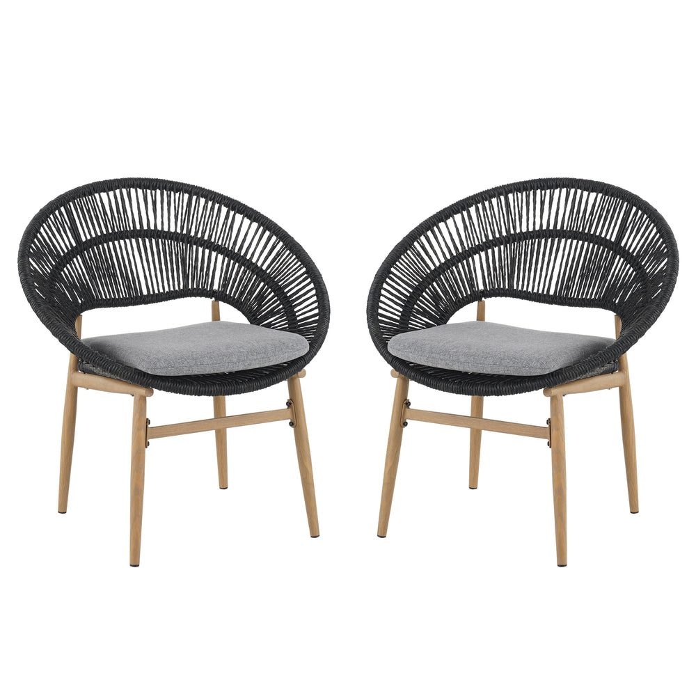 The Cyril Outdoor Wicker Papasan Style Dining Chair set adds a stylish and comfortable seating option to your garden or patio. With a sophisticated blend of teak-finished legs and dark gray faux rattan, these chairs complement outdoor dining spaces with modern elegance.
