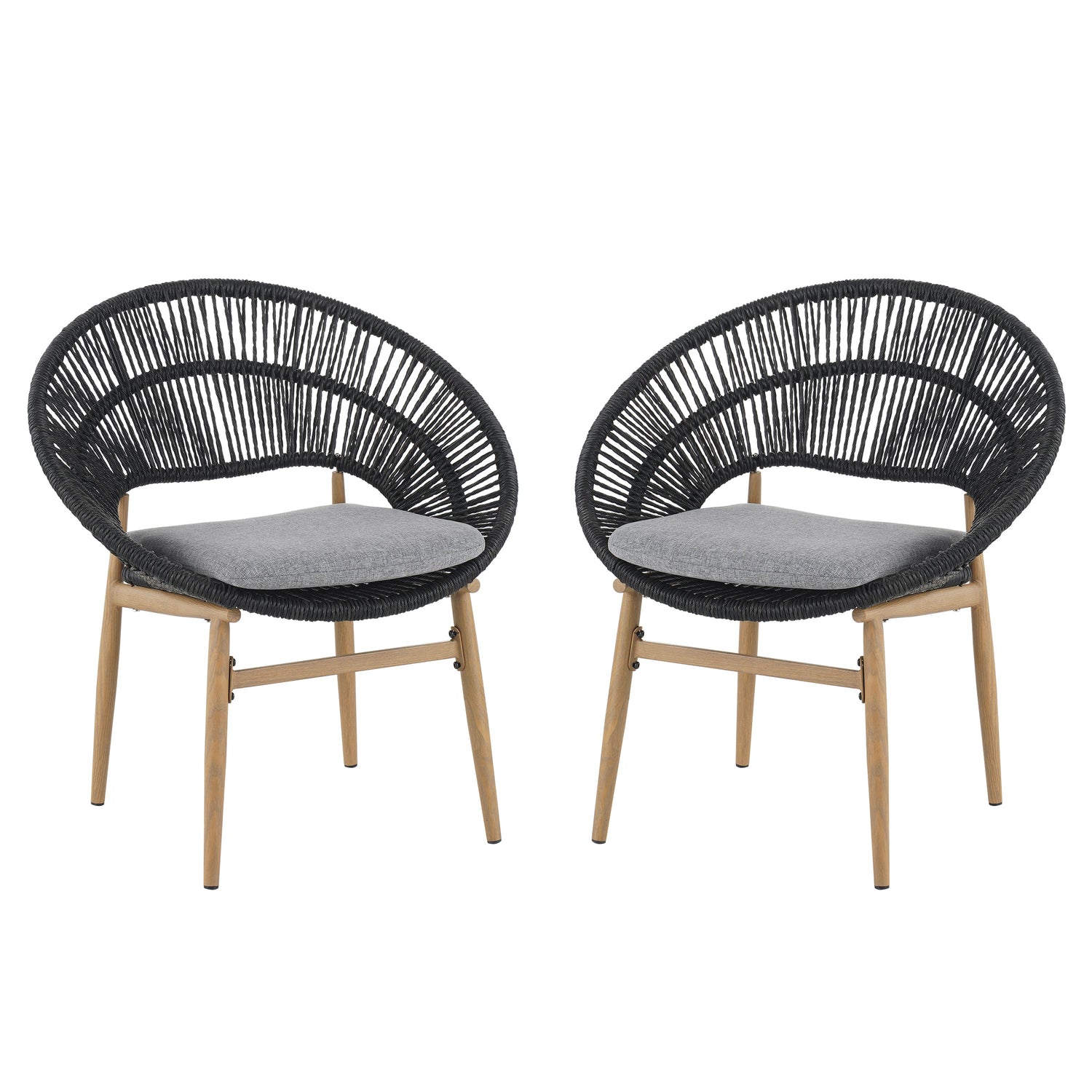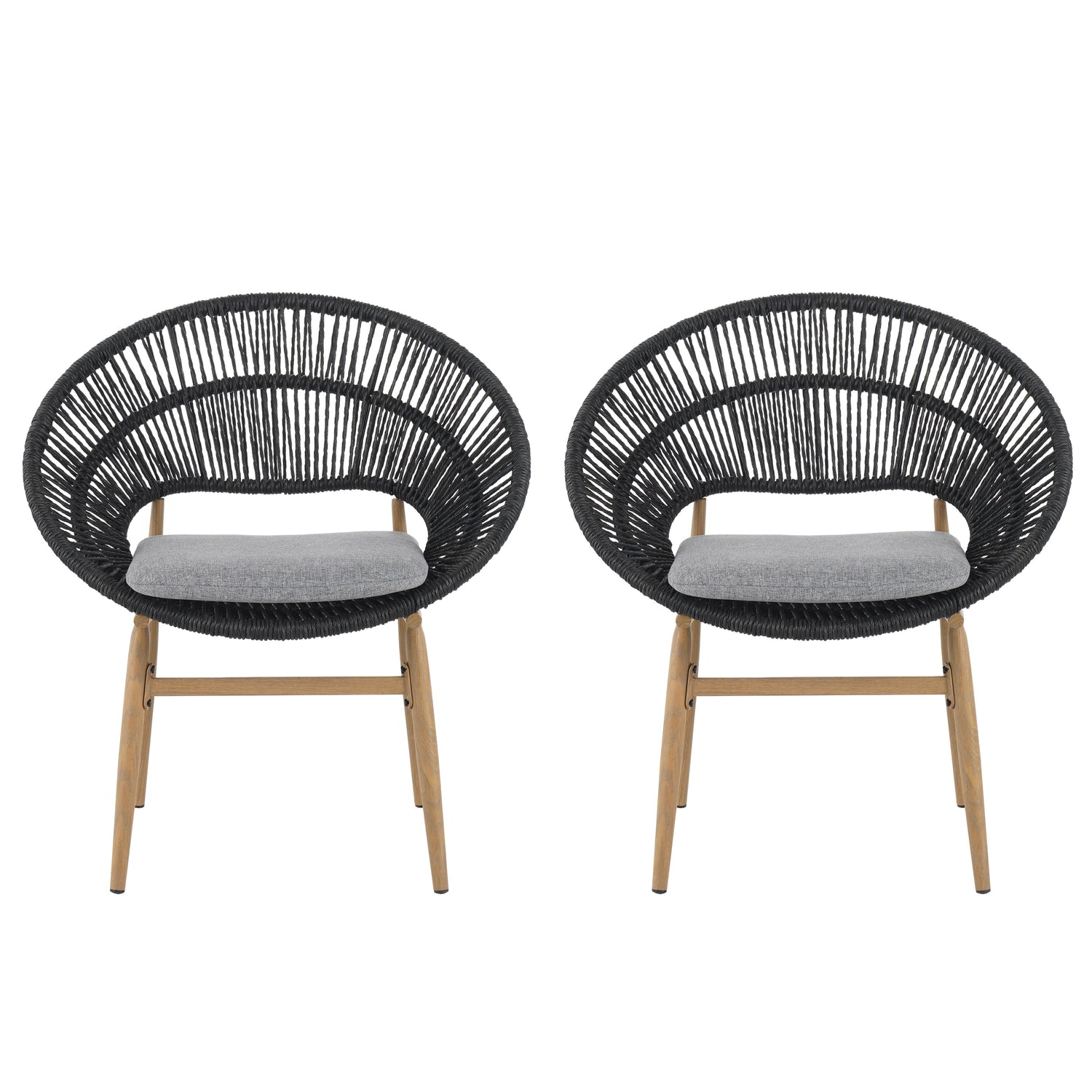 Cyril Outdoor Wicker Papasan Style Dining Chair with Teak Finished Leg and Dark Gray Faux Rattan - Set of 2