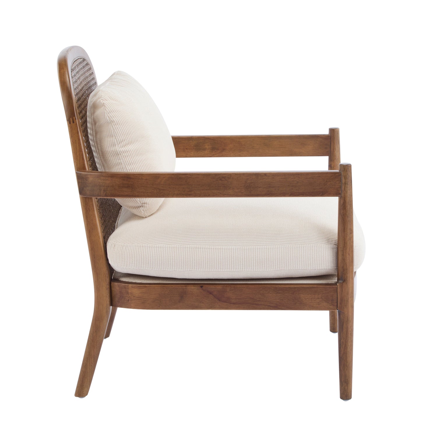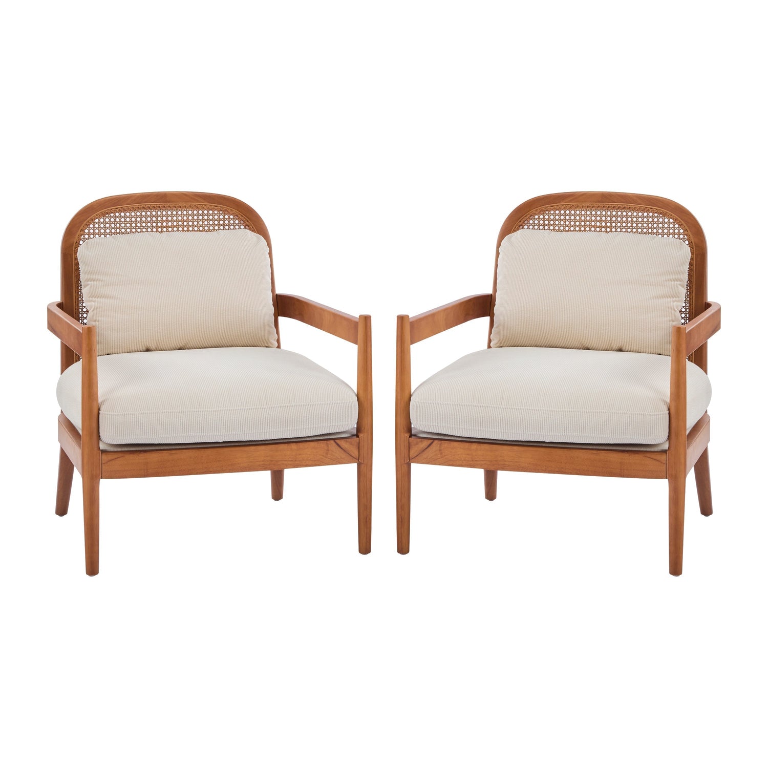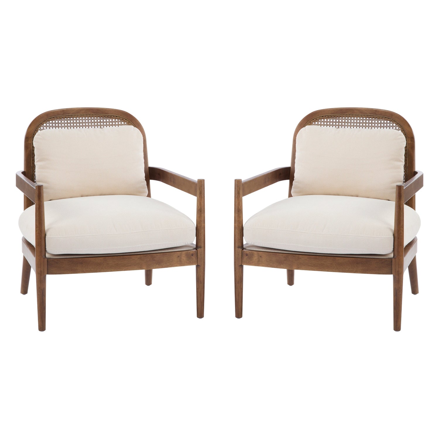 The Elliston Accent Chair set includes two mid-century modern style chairs featuring solid wood frames and rattan backrests. These chairs are ideal for enhancing living rooms, bedrooms, or reading nooks with both comfort and style.