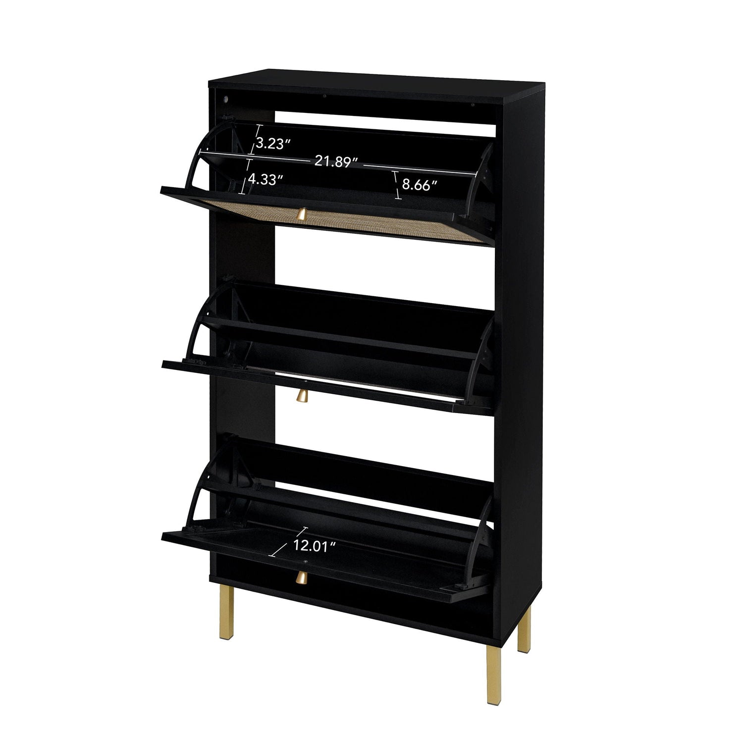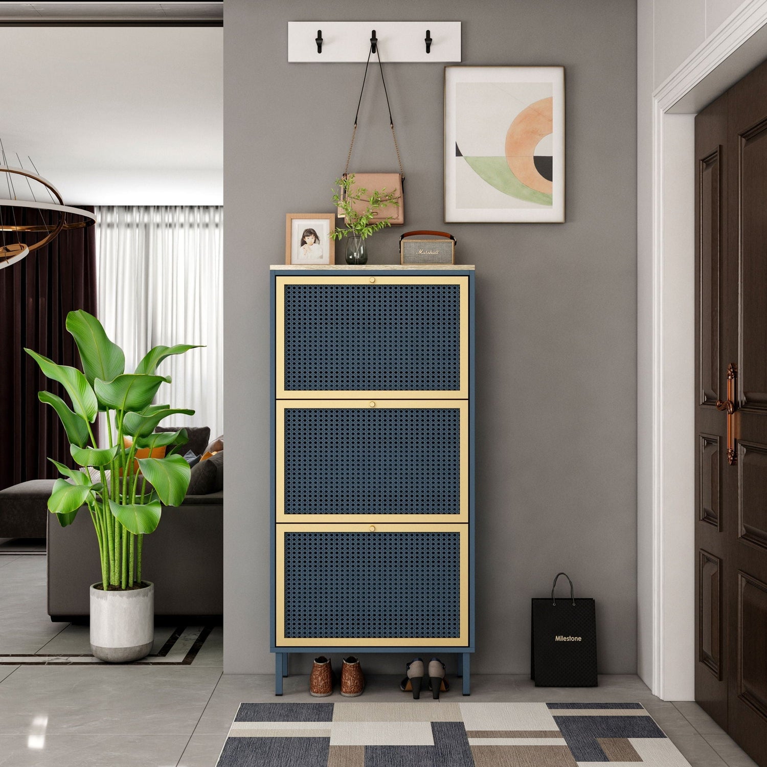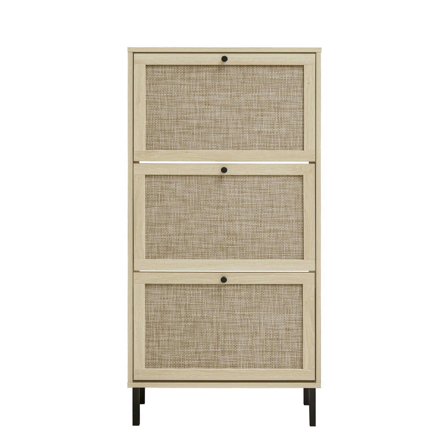This modern shoe rack cabinet efficiently organizes footwear in your entryway while enhancing the space with a contemporary rattan and wood design featuring three doors.