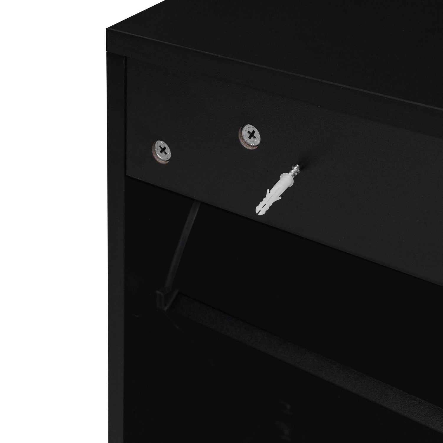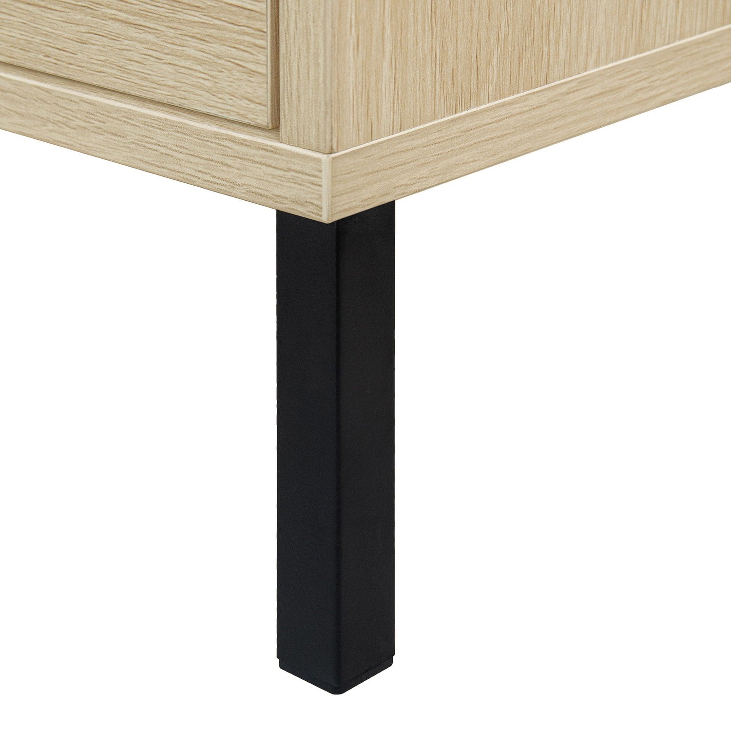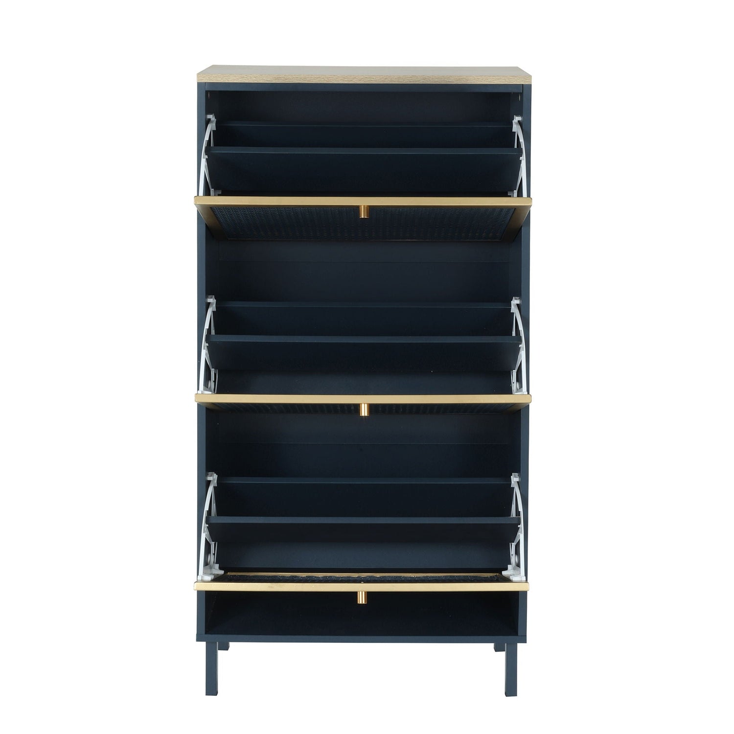 This modern shoe rack cabinet efficiently organizes footwear in your entryway while enhancing the space with a contemporary rattan and wood design featuring three doors.