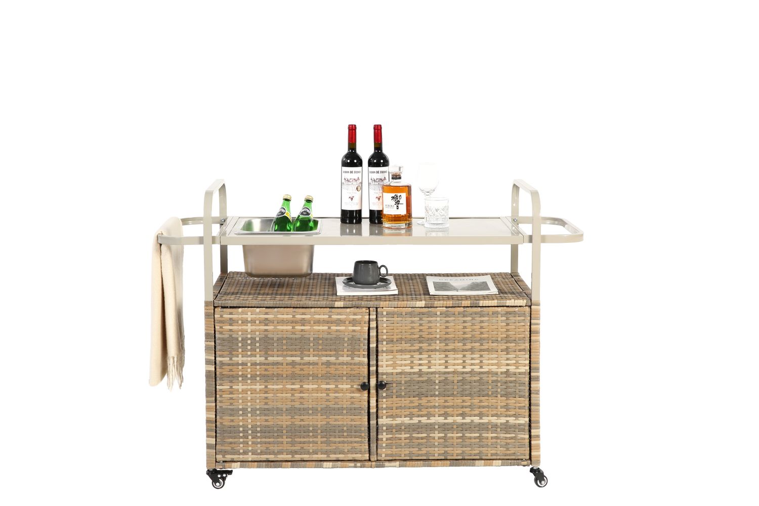 This outdoor bar table combines functionality and style, making it an ideal addition to your garden, patio, or poolside area. It serves as a convenient serving cart with a spacious cabinet and a durable steel top.