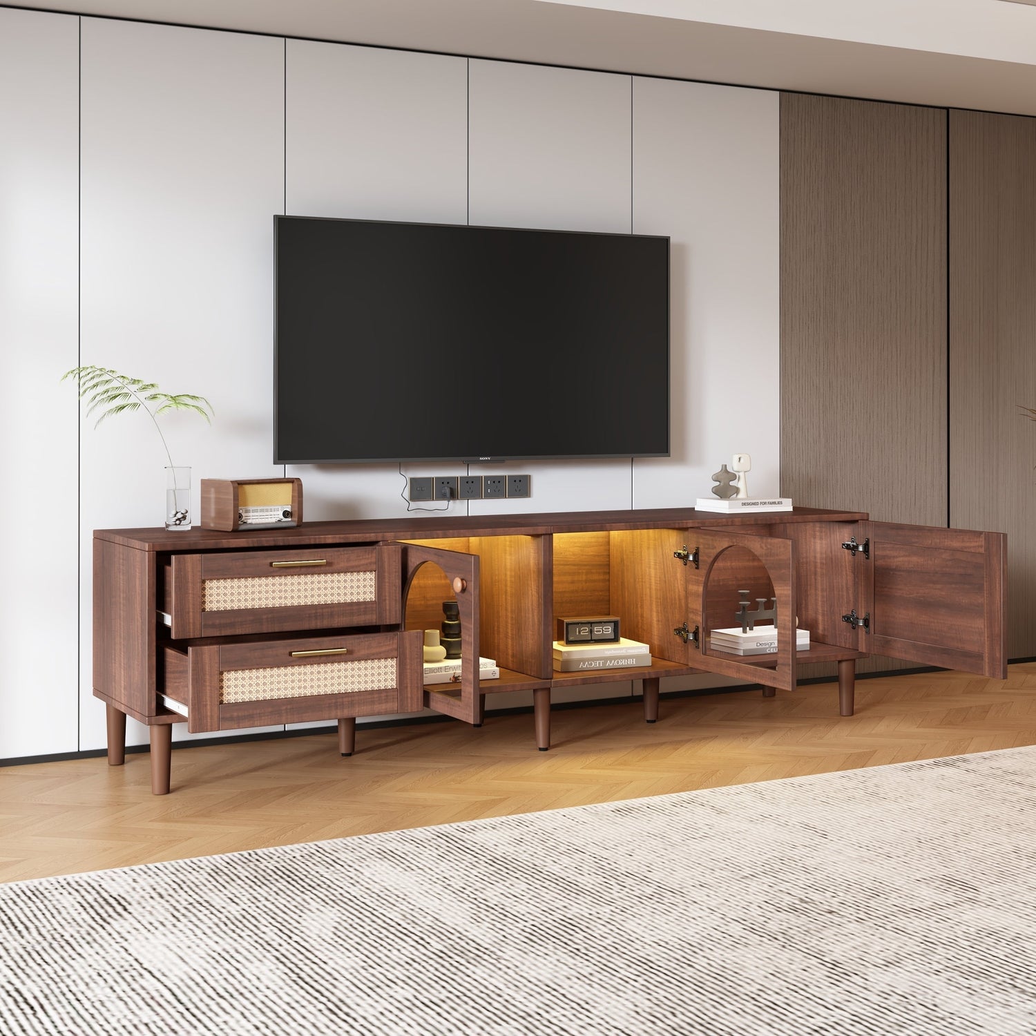This rattan TV stand blends rustic elegance with functional storage, designed for living rooms or entertainment areas to hold TVs up to 80 inches. Its dark brown finish and woven texture enhance any space with a touch of sophistication.
