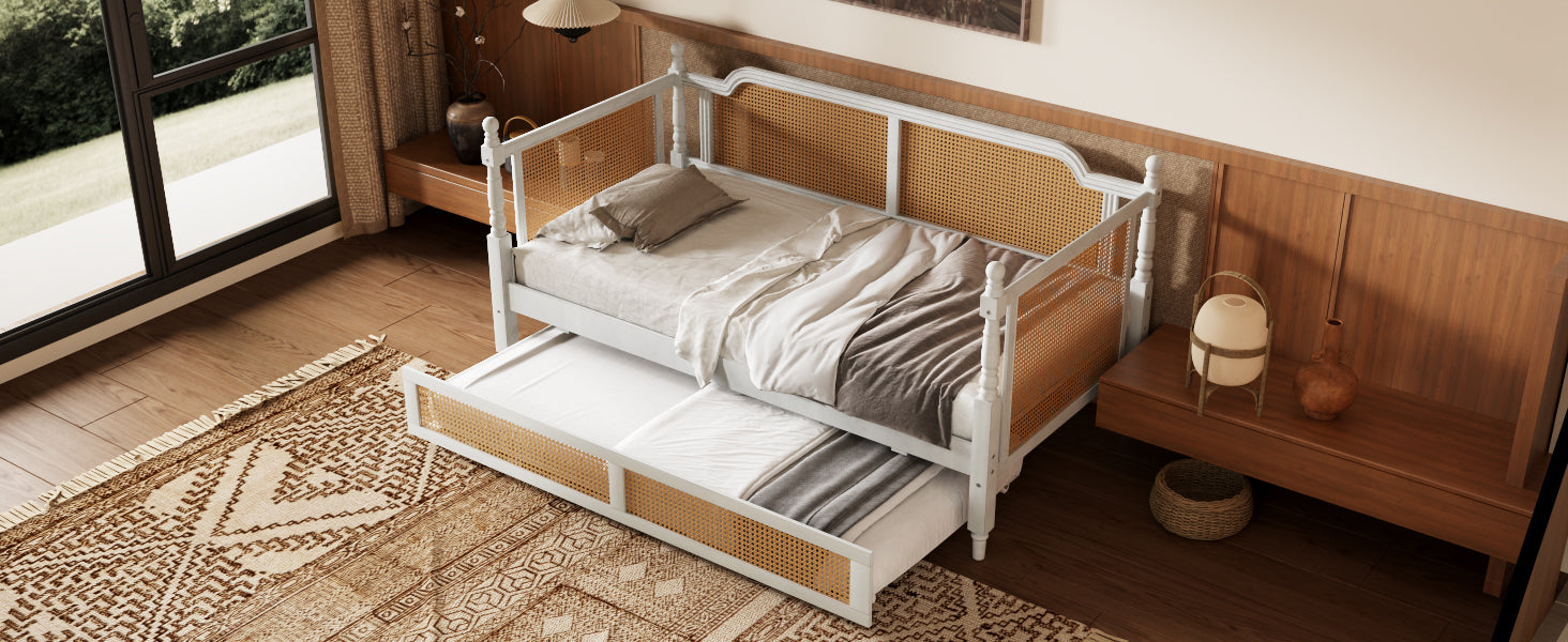 This traditional style twin size daybed fits perfectly in a bedroom setting, combining functional sleeping space with classic rattan design and an additional twin trundle for extra sleeping capacity.