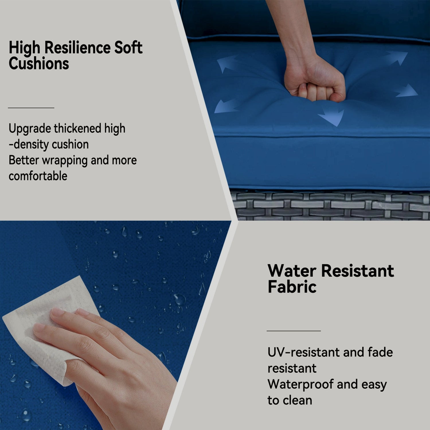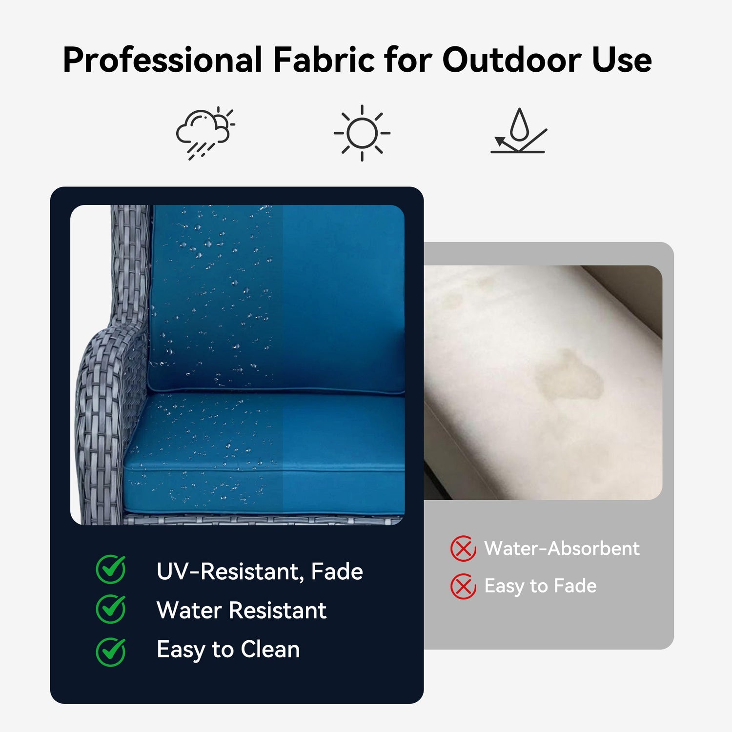 - Water-resistant cushions made with waterproof fabric and foam fillers
