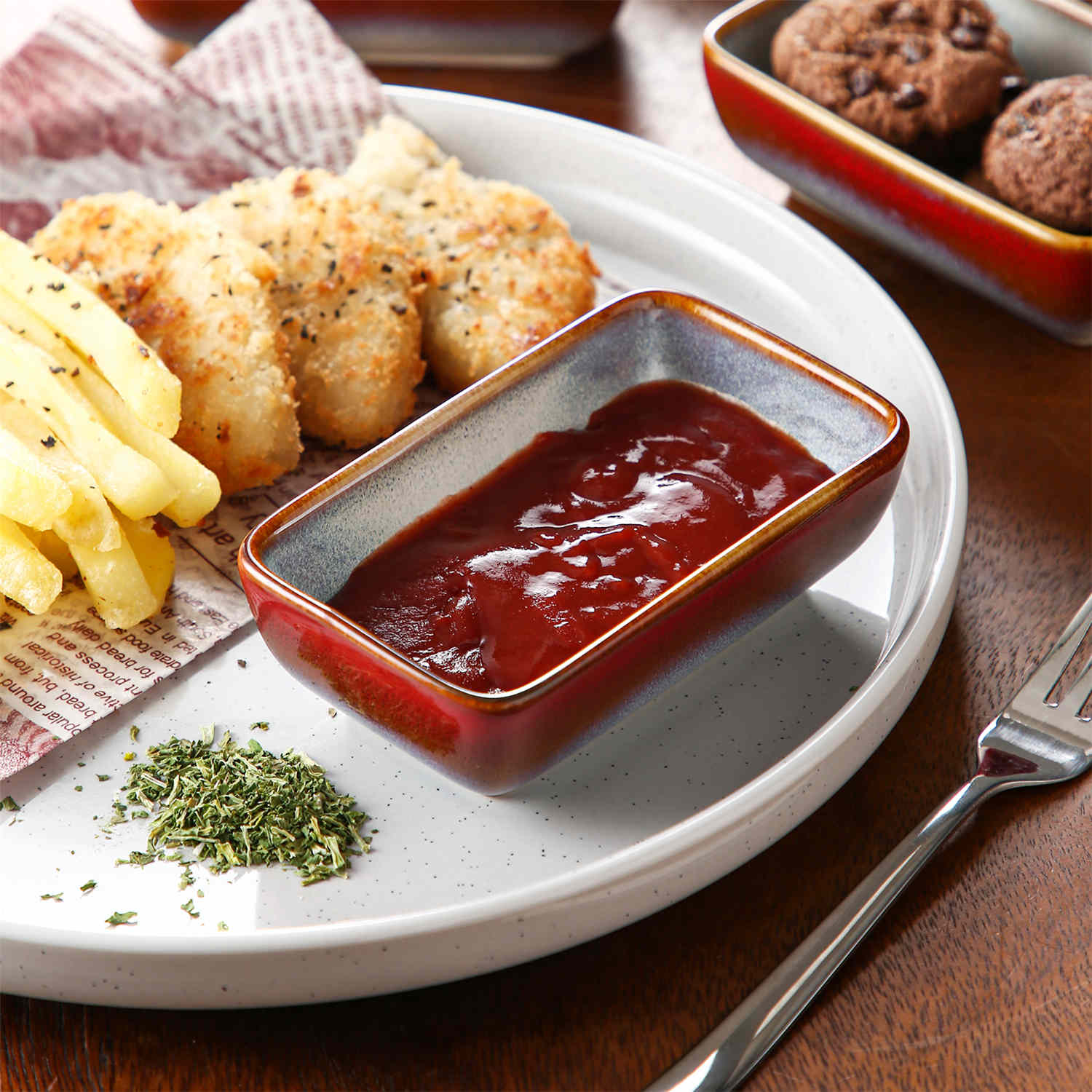 Gloss finish, reactive glaze rectangular dipping bowls from Stern collection