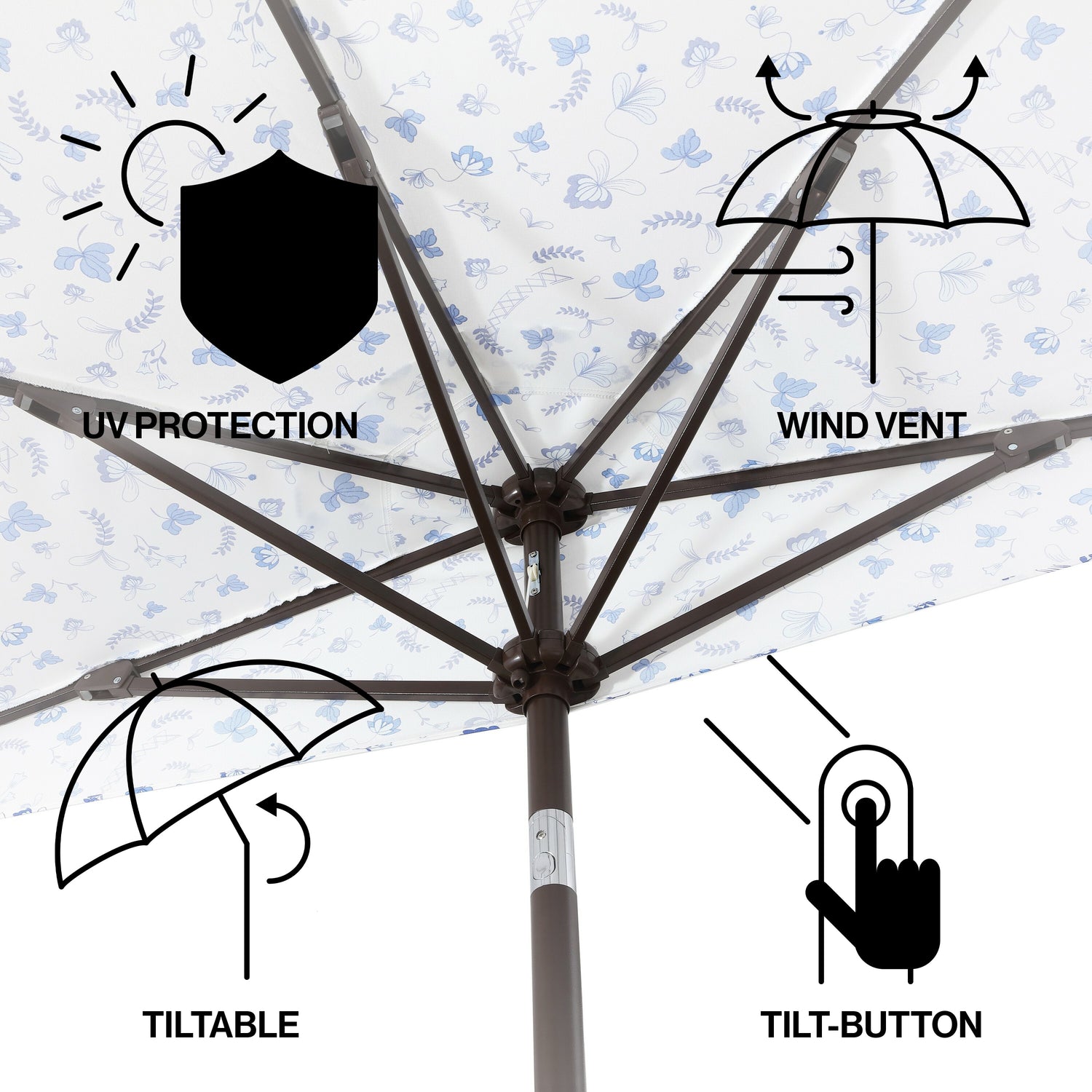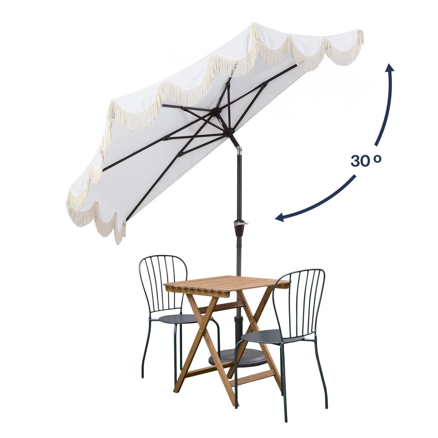 Designed with both style and function in mind, this umbrella includes a 30-degree tilt mechanism and smooth hand crank, allowing you to easily adjust your shade as the sun moves throughout the day. The dark brown aluminum pole adds contrast and durability to the overall design.
