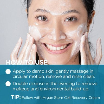 Fruit stem cell complex with argan stem cells and kombucha probiotics gently diffuse into a creamy lather of rich emollients as willow bark purifies pores and aloe vera polysaccharides whisk away excess oil and dull, dry surface cells for a clear, balanced complexion. Formulated for oily and blemish prone skin.