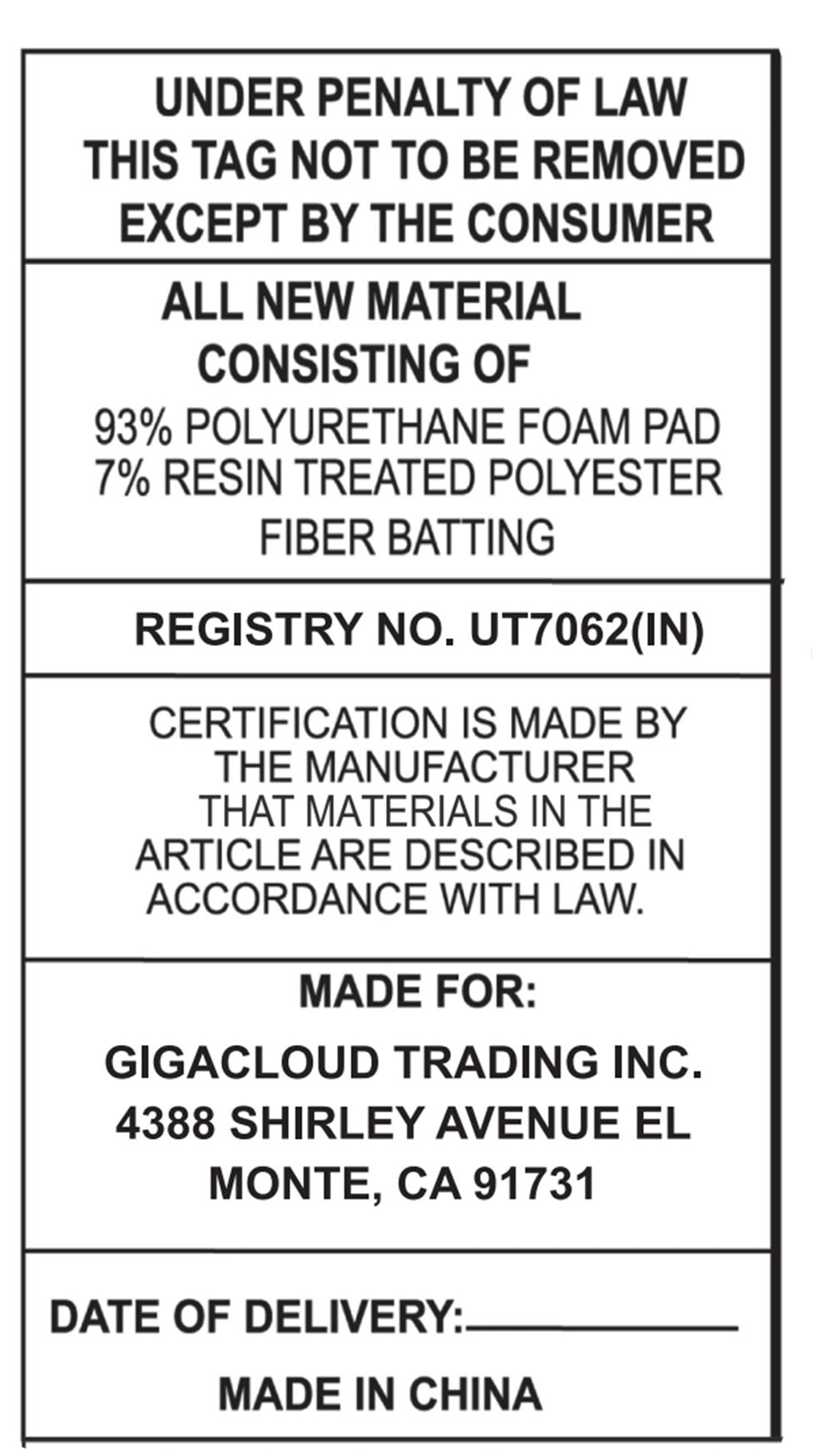 | Foam Density | 1.75 lbs./cu.ft |