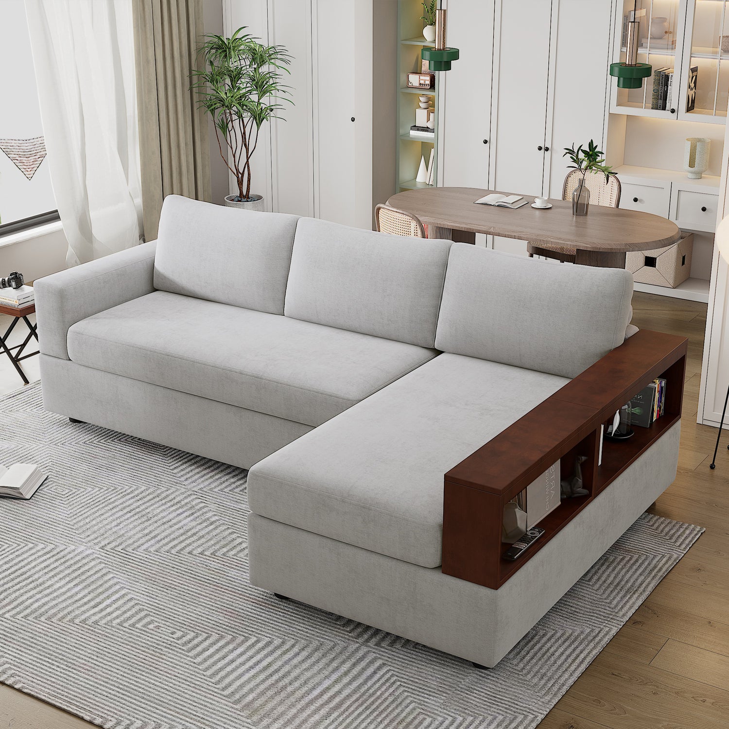 This sectional sofa combines style, comfort, and functionality for an exceptional seating experience. Crafted with breathable chenille fabric and a sturdy frame, it ensures long-lasting durability and stability. The high-density foam cushions with inner springs provide superior comfort and support. Its reversible armrest design, with interchangeable square armrests and a storage rack, offers versatile storage options to suit your needs. The integrated chaise lounge adds extra comfort and versatility, perfect for lounging, reading, or relaxing. With ergonomically designed back cushions and a 19.7-inch seat depth, this sofa delivers optimal support and comfort, making it ideal for extended lounging or social gatherings. Whether you’re seeking relaxation or a stylish addition to your living space, this sofa has it all.