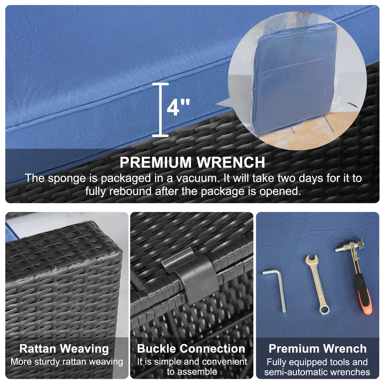 • Patio Furniture Set: Our patio furniture set comes with 4 inches of soft sponge cushions, providing you with great comfort. This outdoor patio furniture set is suitable for both indoor and outdoor use, ideal for poolside, garden, patio, terrace, backyard, porch, balcony, etc.