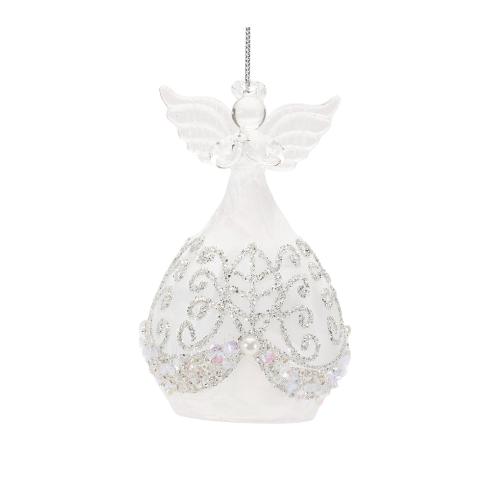 Add a celestial touch to your holiday décor with this set of Beaded Glass Angel Ornaments. Designed in wintry white and silver tones with a chic frosted glass finish, these ornaments feature an elegant angel design with a graceful teardrop shape. Adorned with ornate glittered touches, beaded accents, and pearl details, these angels bring a refined, heavenly glow to your Christmas tree. The delicate string hanger adds the perfect finishing touch, making this set of 4 ornaments ideal for enhancing your Christmas tree, wreath, or garland, and creating a statement in your seasonal display.
