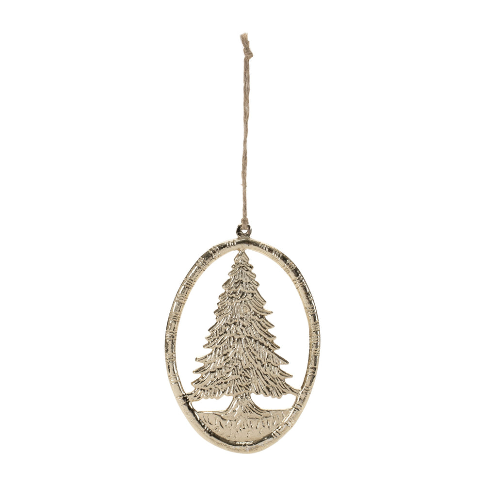Enhance your holiday tree with the Etched Metal Pine Tree Ornament. Crafted from gray-toned aluminum, this ornament boasts a chic metallic finish and a beautifully etched woodland pine tree design in a unique oval shape. The rustic accents and delicate jute string hanger add a natural, festive touch. Sold in a set of 12 matching pieces, this ornament is perfect for adorning your tree or gifting to loved ones to share the warmth and beauty of the season.