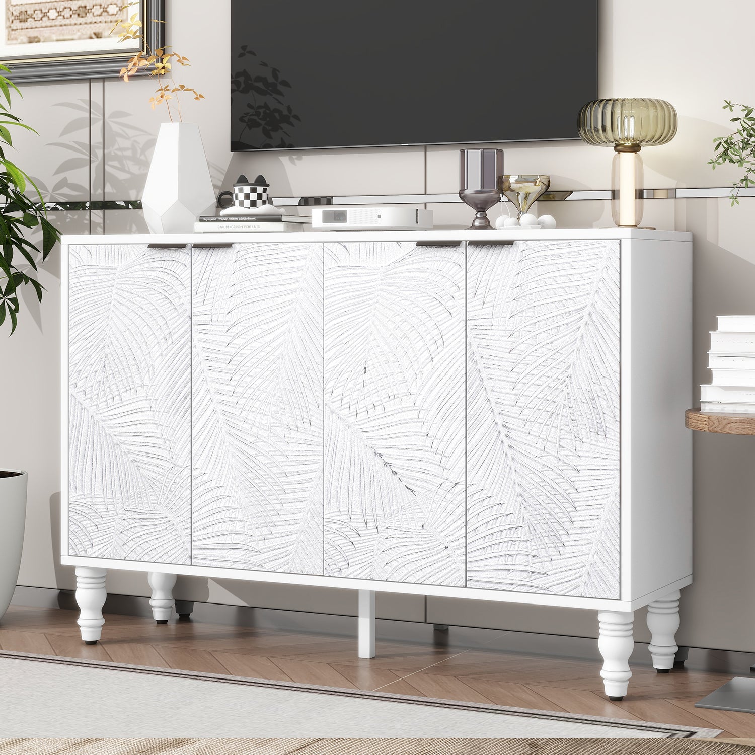 This sleek and modern TV stand, characterized by its stylish and flowing line design, seamlessly integrates modern aesthetics with natural allure. The intricate leaf patterns adorning its cabinet door breathe life into the indoor ambiance. Its refined handle design not only ensures a comfortable grip but also enhances the overall user experience. Positioned in either a spacious living room or a cozy bedroom, it swiftly captures attention, adding a vibrant touch. Featuring two spacious storage compartments and adjustable shelves, the TV cabinet offers versatile storage options tailored to meet a wide range of needs. From electronic gadgets to daily trinkets, it provides ample space for easy storage. Additionally, the inclusion of an anti-tipping device ensures heightened safety. Complete with all parts and comprehensive assembly instructions, the installation process is rendered straightforward and swift.