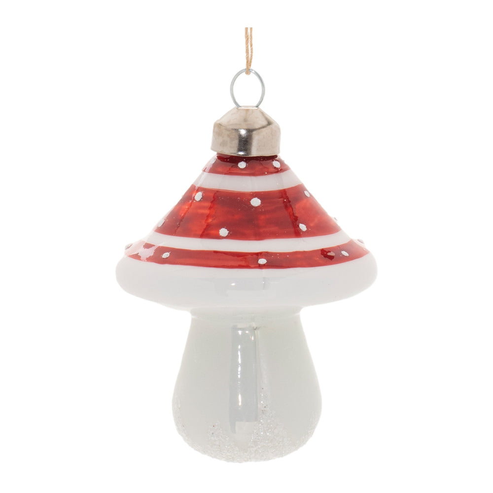 Add a whimsical touch to your holiday décor with this set of Glittered Glass Mushroom Ornaments. Featuring festive red and white tones with a glossy finish and glittered accents, these playful mushrooms are designed with a dotted top, bringing a fun, woodland-inspired charm to your tree. The silver ornament cap and delicate string hanger complete the look, making these ornaments perfect for adding a touch of elegant cheer to your Christmas tree, wreath, or garland. Whether placed on your tree or woven into your seasonal display, this set of 6 ornaments bring a magical, nature-inspired feel to your home.