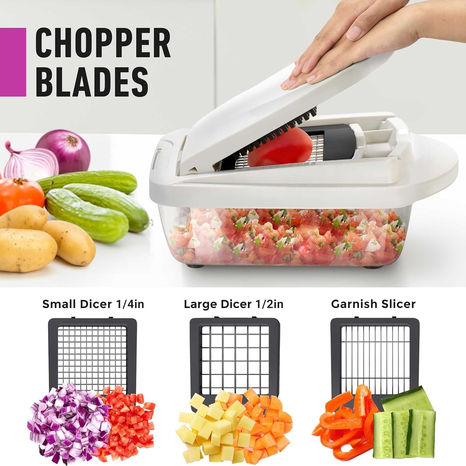 Make everyday cooking faster and more efficient with this 8-in-1 vegetable slicer and chopper. Designed to slice, dice, and grate with precision, it includes a built-in container to keep your countertop clean while you prepare meals.