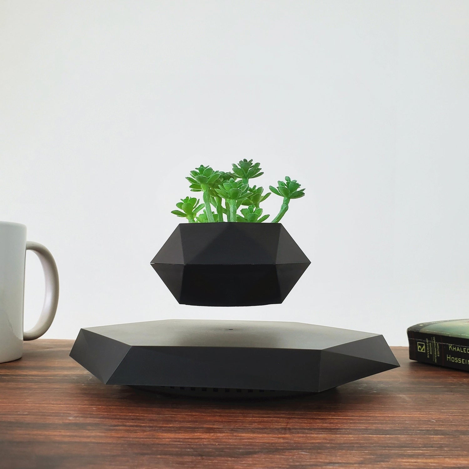 Bring futuristic flair and natural beauty together with this magnetic levitating plant pot. Designed with a bold geometric shape and hexagonal base, this planter gently rotates mid-air, creating a gravity-defying display for air plants, succulents, or bonsai. Perfect for tech-inspired decor or calming home accents.