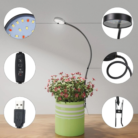 USB LED Grow Light Full Spectrum Clip On Plant Lamp Dimmable Timer Gooseneck