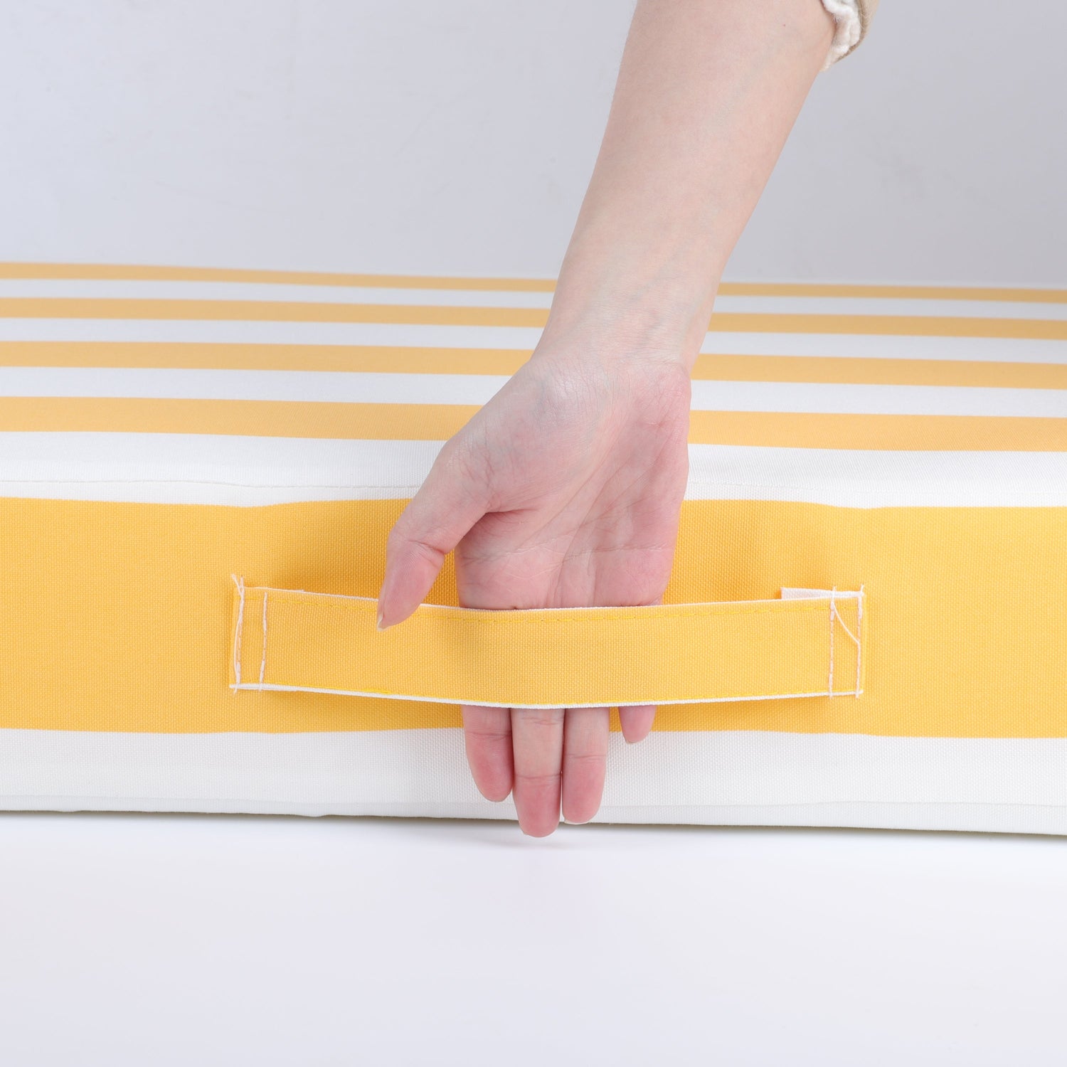 This set of deep seat cushions is designed for outdoor use on patio chairs, sofas, and porch swings, offering a combination of comfort and durability with a stylish yellow and white color scheme.