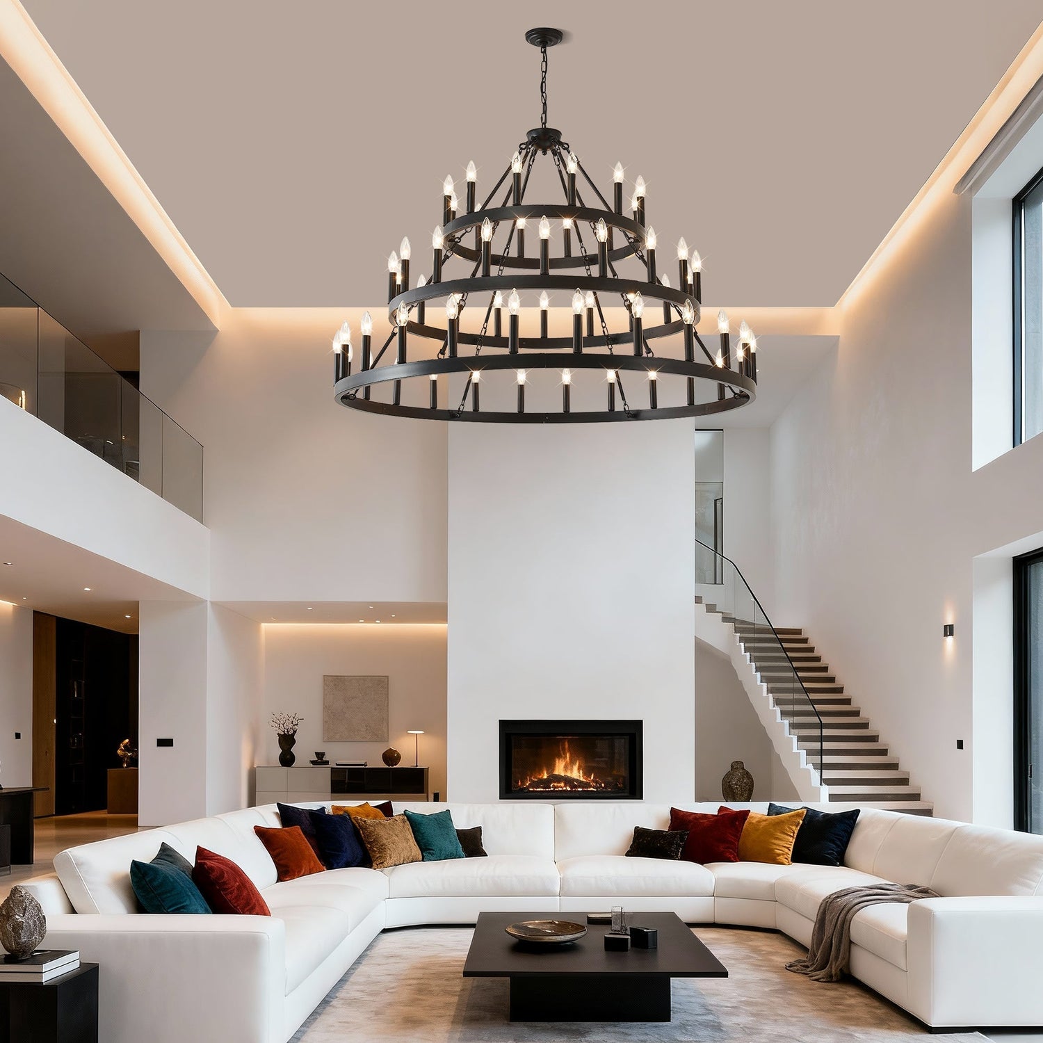 This large 3-tier wagon wheel chandelier features 54 lights and fits perfectly in living rooms, dining rooms, and foyers with high ceilings. Combining farmhouse charm with industrial style, it provides soft, ambient illumination and serves as a stunning focal point.