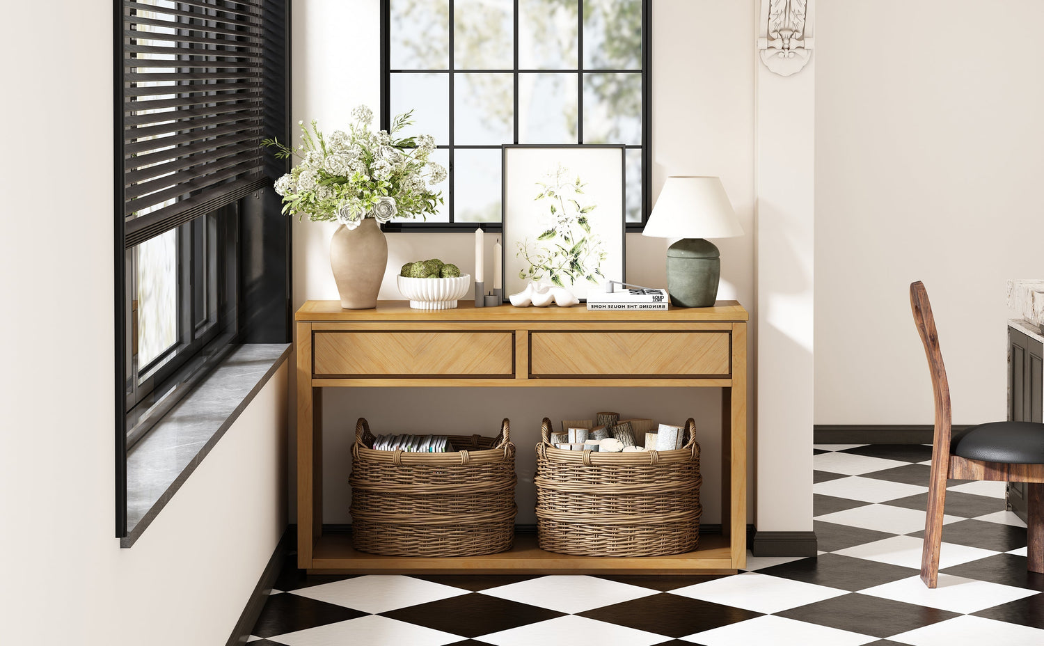 Equipped with two sliding drawersthis entry table offers ample storage space for your everyday essentials. Whether it's keysmailor other small itemsthe drawers keep everything organized and within easy reach. The smooth gliding mechanism ensures effortless accesswhile the seamless design integrates the storage perfectly into the table's elegant structure.
