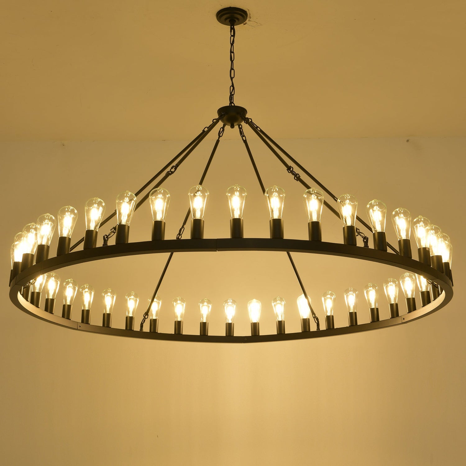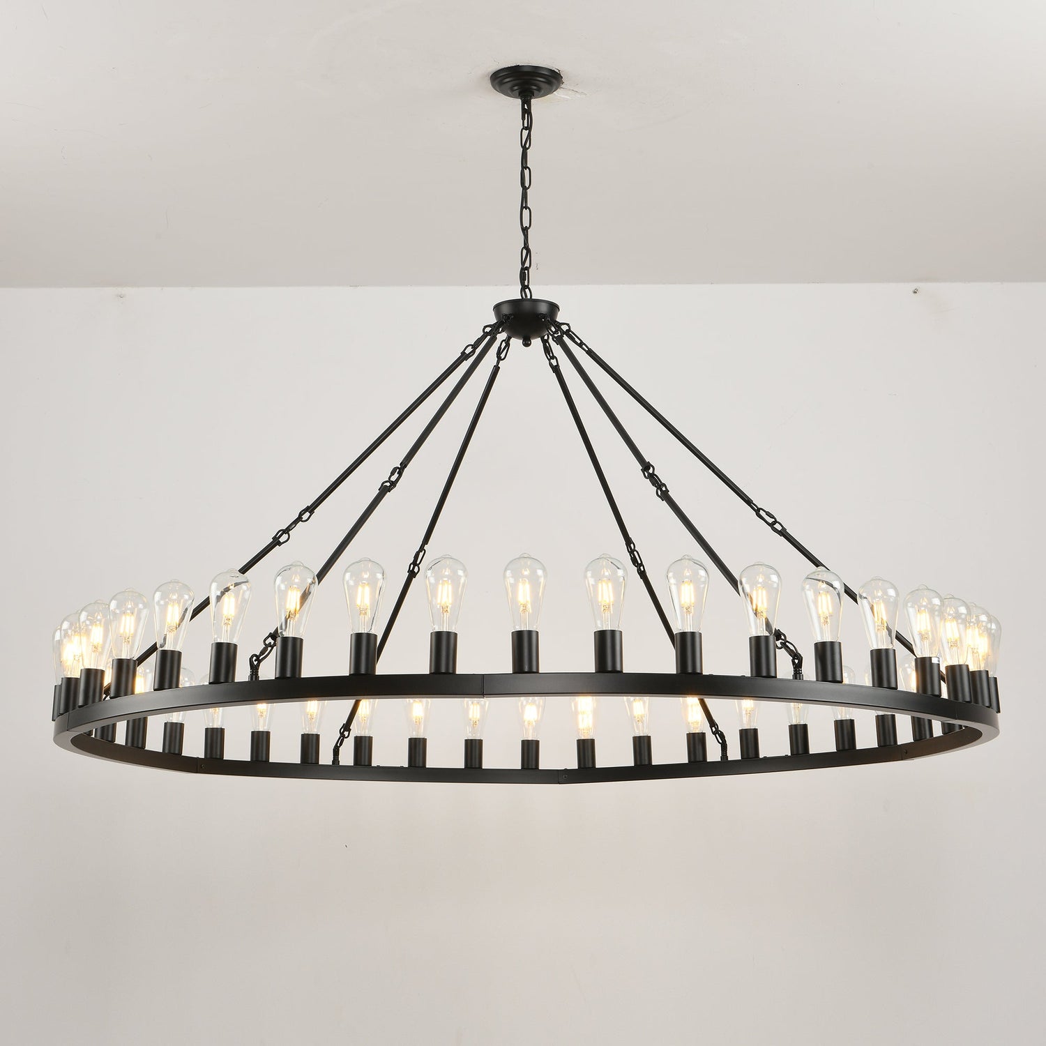 This 64-inch matte black wagon wheel chandelier offers functional and stylish lighting, perfect for enhancing living rooms, dining rooms, foyers, and kitchens. It delivers ample illumination with a blend of classic and contemporary design elements.