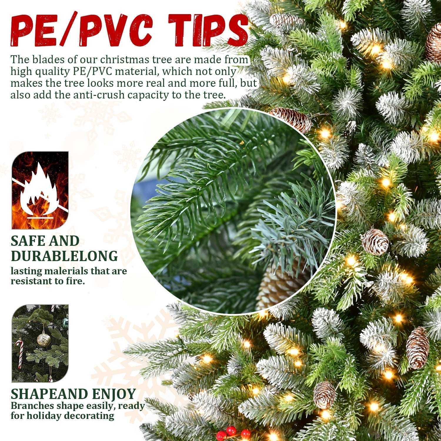 • Decorative snow-dusted leaf tips add a natural winter wonderland aesthetic