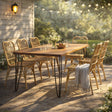 This 7-piece outdoor dining set accommodates six people and is perfect for patios, decks, backyards, or porches. Combining a rectangular acacia wood table with six hand-woven rattan chairs, it offers a balance of functional dining furniture and modern style.