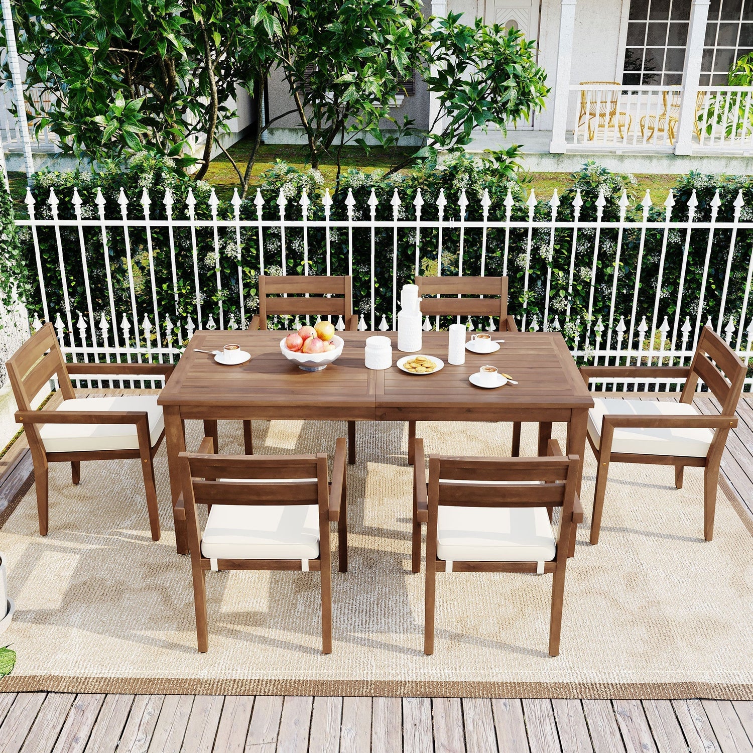 This 7-piece outdoor dining set includes a sturdy acacia wood table and cushioned chairs, ideal for patio or indoor dining spaces. It combines natural wood durability with comfortable seating for versatile use.