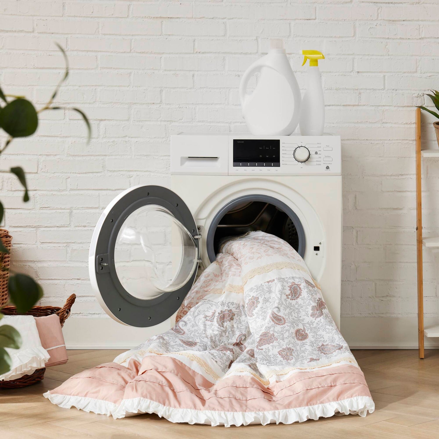 The Madison Park Dawn 9 Piece Cotton Percale Comforter Set offers a shabby chic update to your bedroom decor. A paisley print is featured on the cotton comforter with pintucked fabric separated by lace taping embellishments. Around the edgea ruched flange adds a graceful touchfor a charming cottage look. Matching shams mirror the design of the comforterwhile two solid Euro shams complement the top of the bed. Three decorative pillows and a solid bedskirt complete this farmhouse comforter set. This bedding set is also OEKO-TEX certifiedmeaning it does not contain any harmful substances or chemicals to ensure quality comfort and wellness. A coordinating shower curtain is available and sold separately. Items in the set may come in a rolled or compressed packagingwhich will need to be fluffed up or steam ironed before use to remove wrinkles.