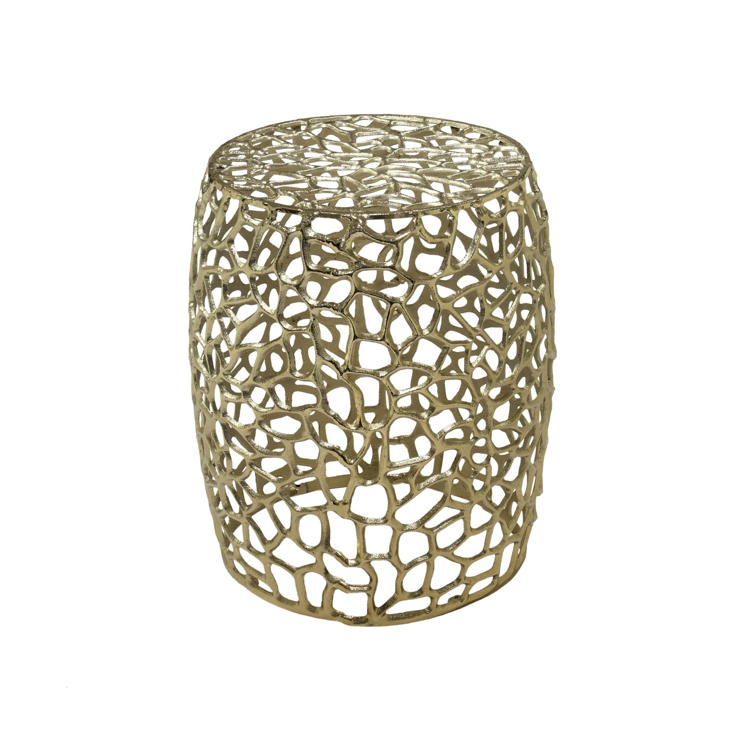 This aluminum drum end table features an intricate abstract mesh design, making it an ideal addition to living rooms, foyers, or seating areas. Its combination of handcrafted artistry and durable materials offers both style and function.
