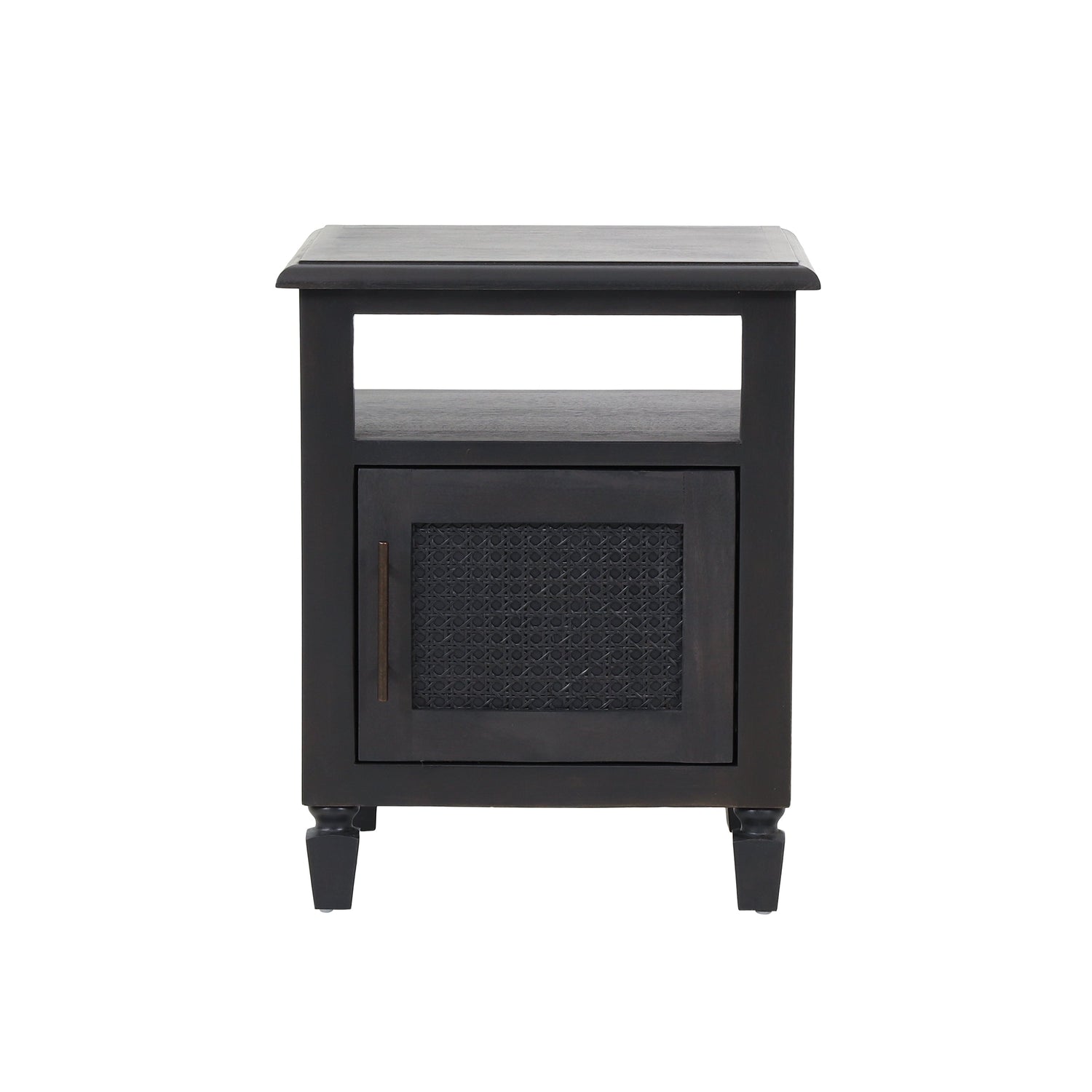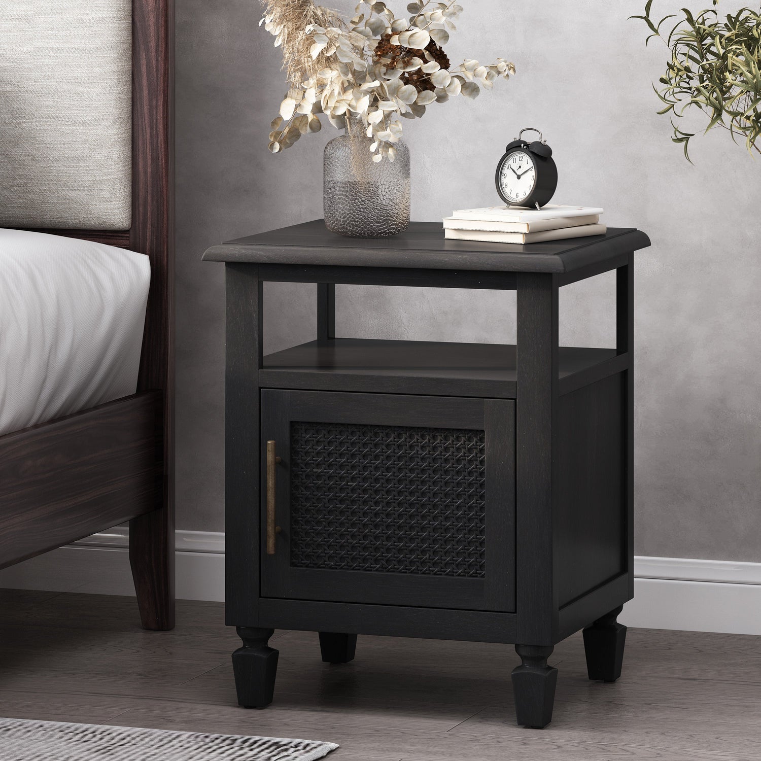 - Featuring a rich combination of acacia wood and cane webbing for an earthynatural designour nightstand brings a stunning rustic look to your home. This charming nightstand is the perfect companion to any room with its convenient cabinet space and open shelf for storing and organizing your clutter. Blending seamlessly with your existing decorthis accessory has a perfect amount of stylish function and homey aesthetics to your bedside.